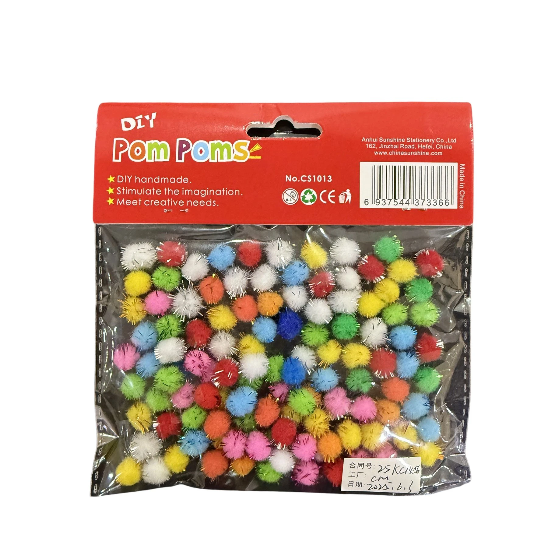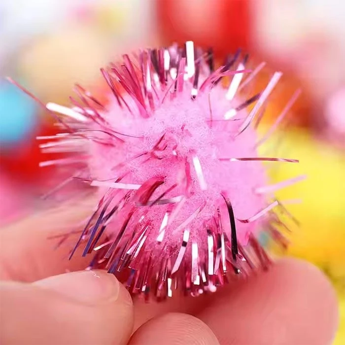 Забавен и креативен комплект от 100 цветни пухкави топчета с блестящи нишки, подходящи за декорация и арт занимания.