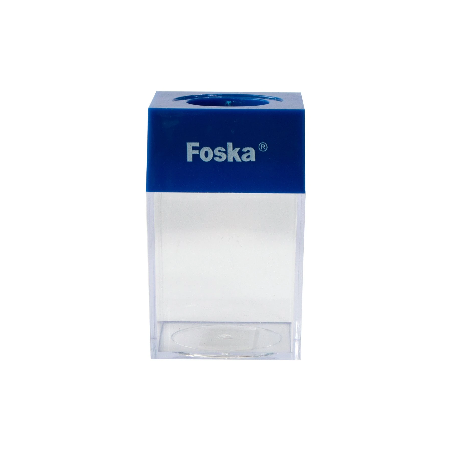 Компактна магнитна поставка за кламери, изработена от прозрачна пластмаса с цветен капак.