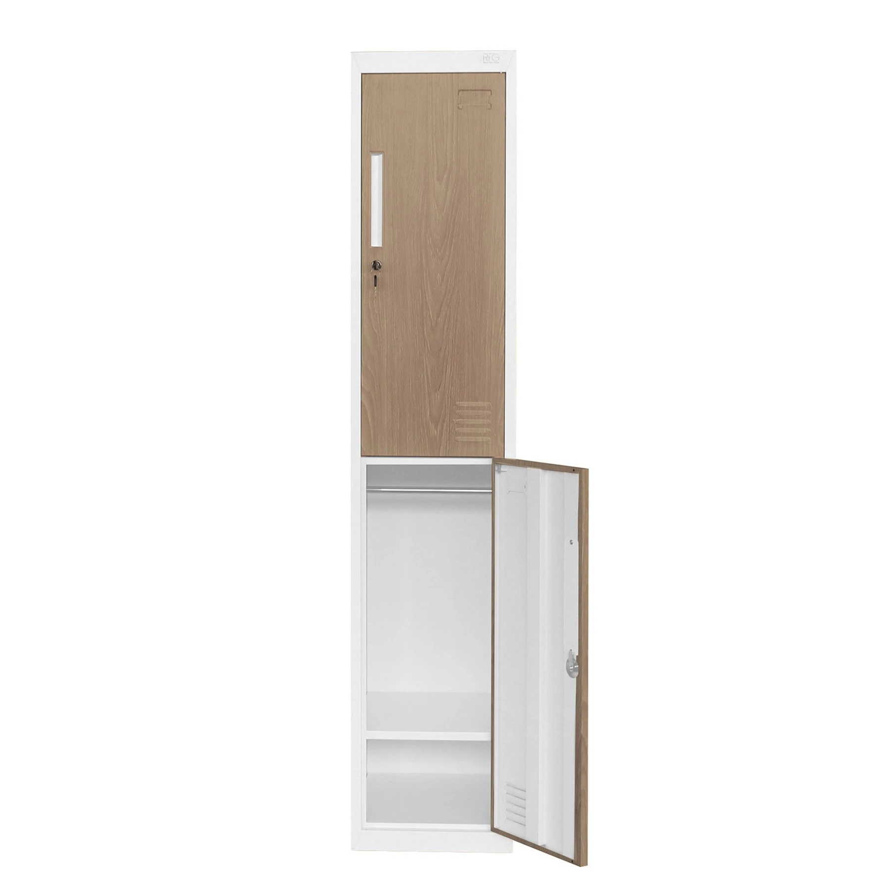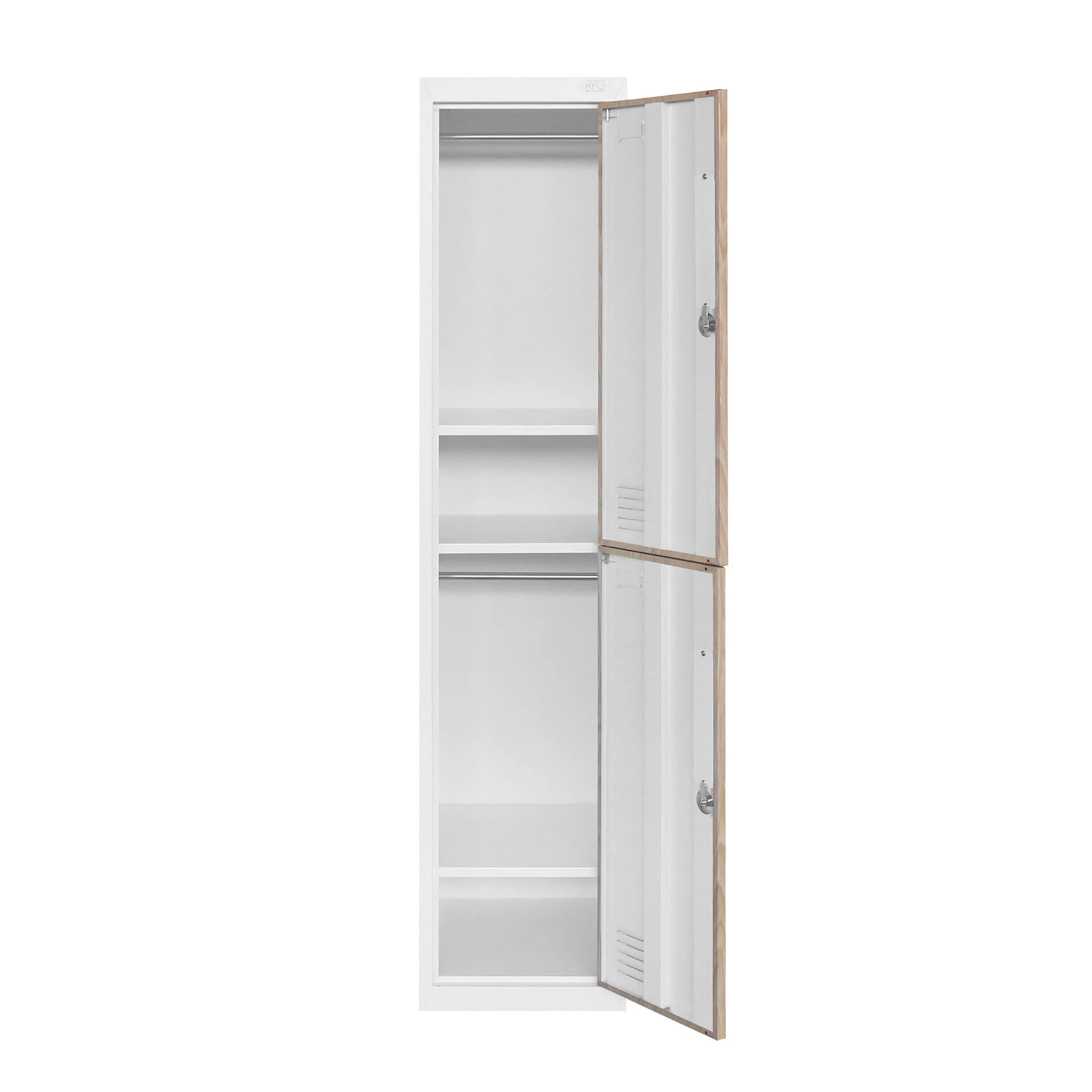 Гардероб RFG, единичен, метален, с две врати, 380 х 450 х 1850 mm, кехлибарен дъб и бяло