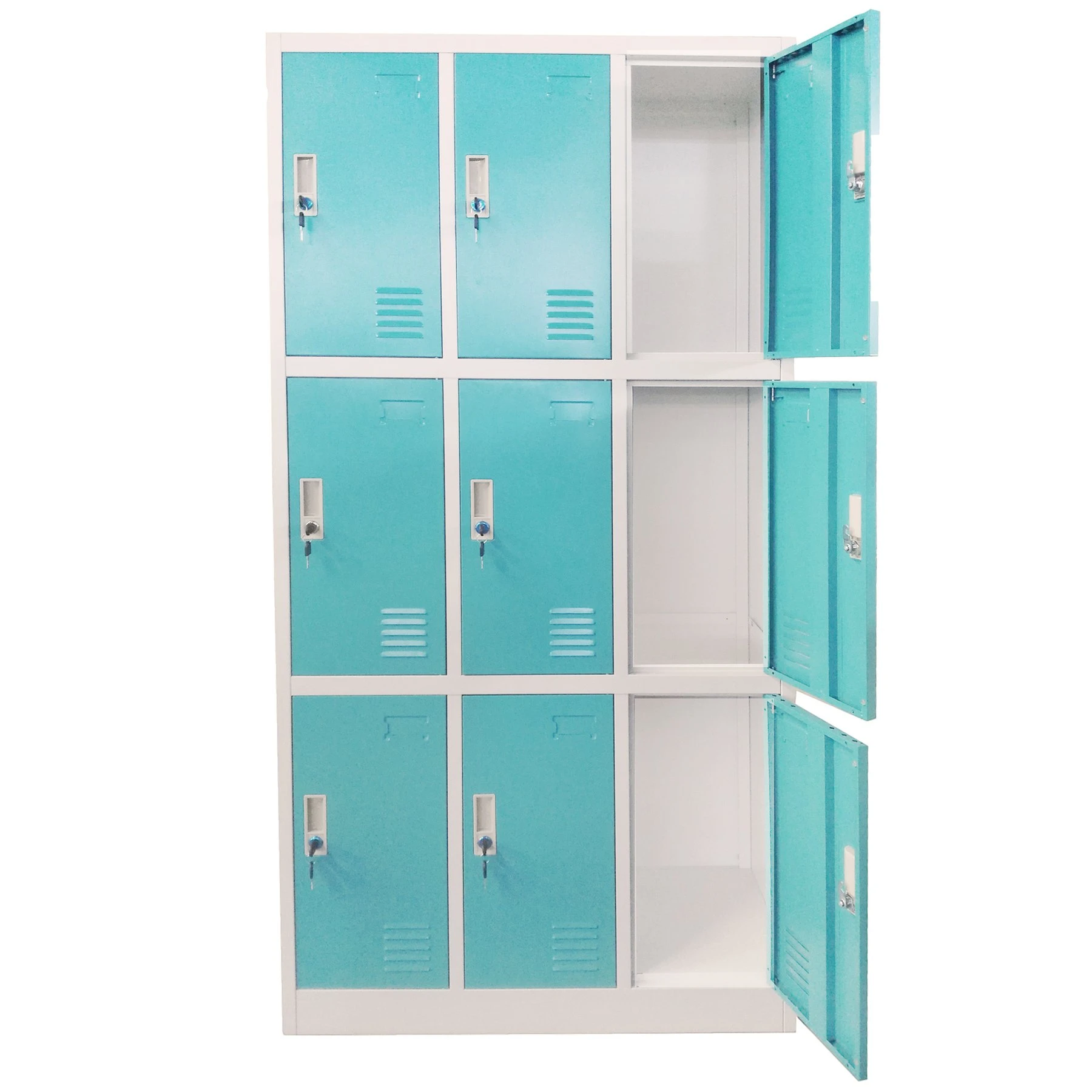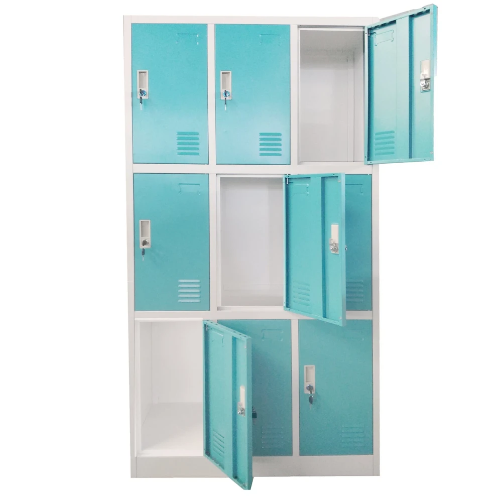 Метален гардероб с 9 метални врати. Има възможност за заключване – уникално за всяка врата. Гардероба има вентилационен отвор.
