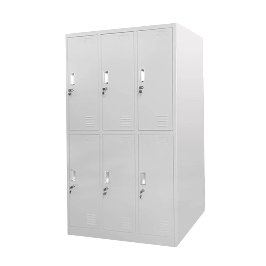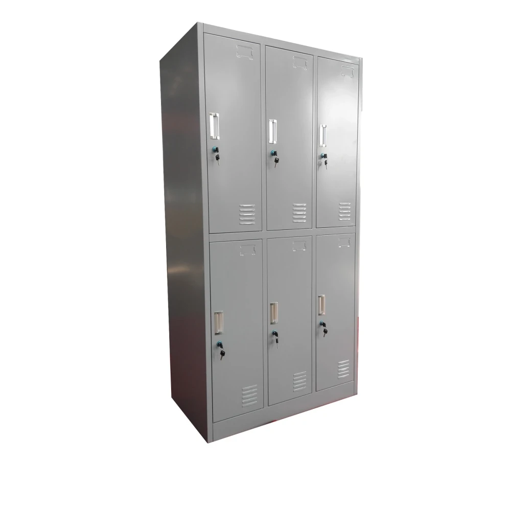 Метален гардероб с 6 метални врати. Всяка едно отделение има по един рафт. Има възможност за заключване – уникално за всяка врата. Гардероба има вентилационен отвор.