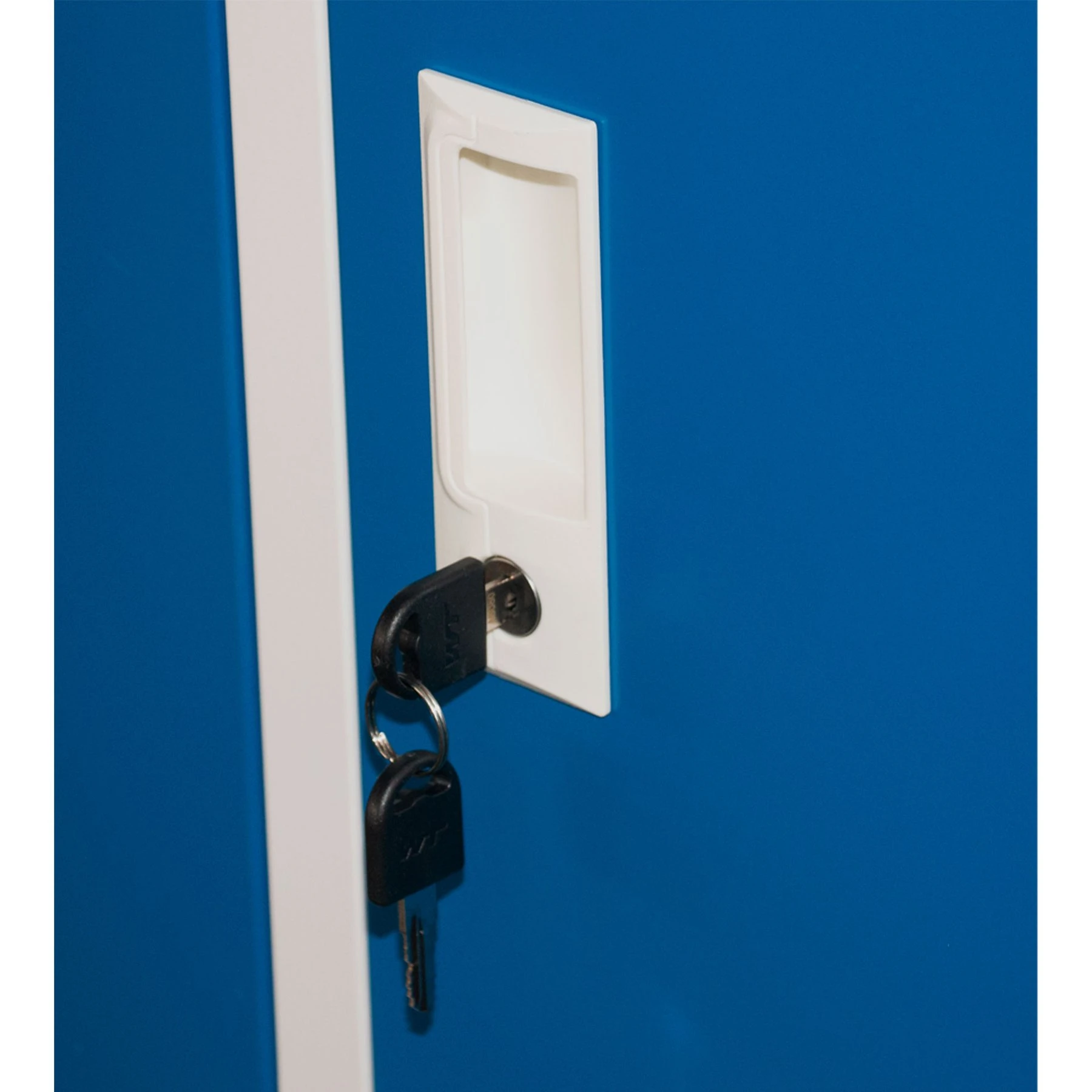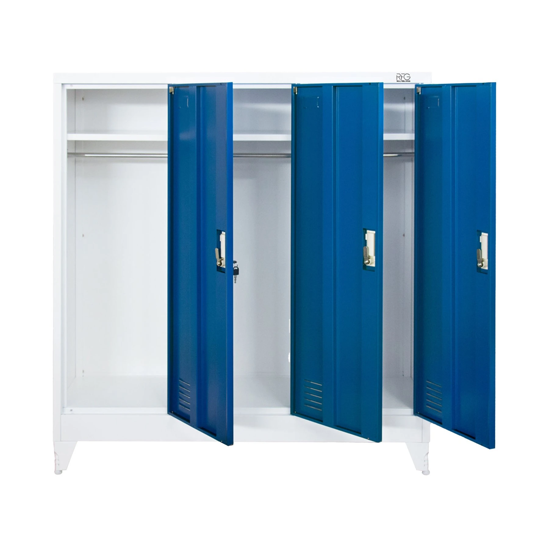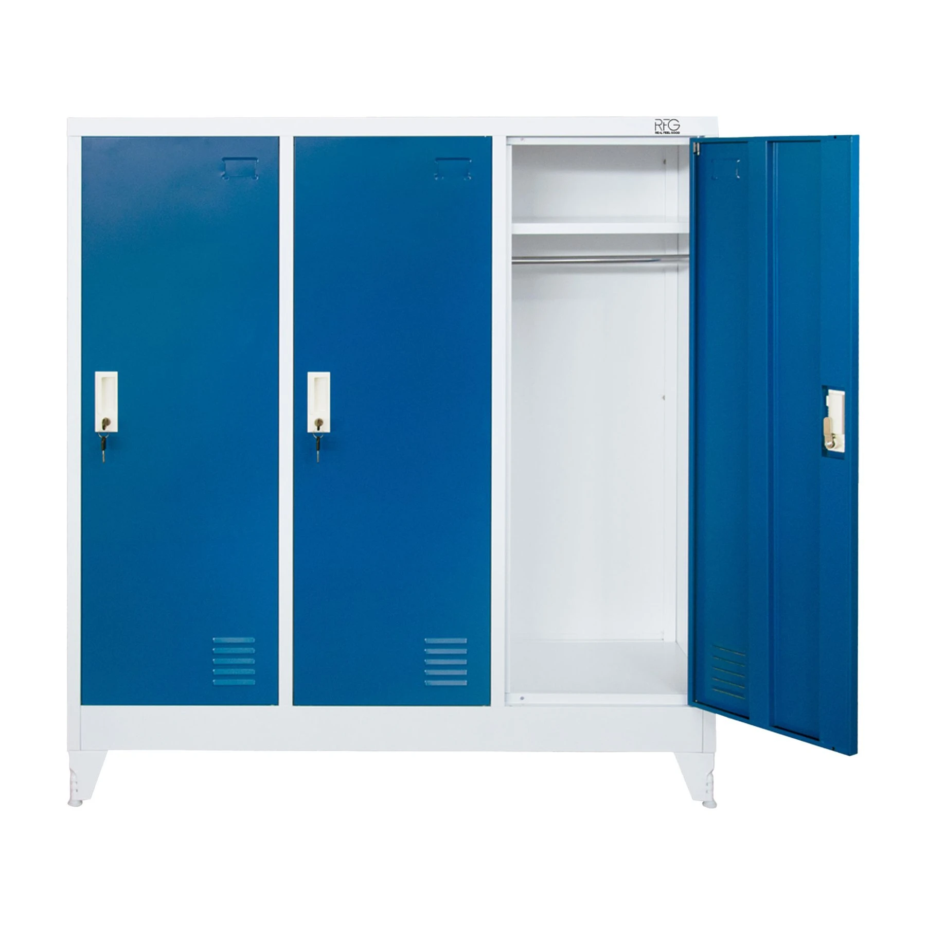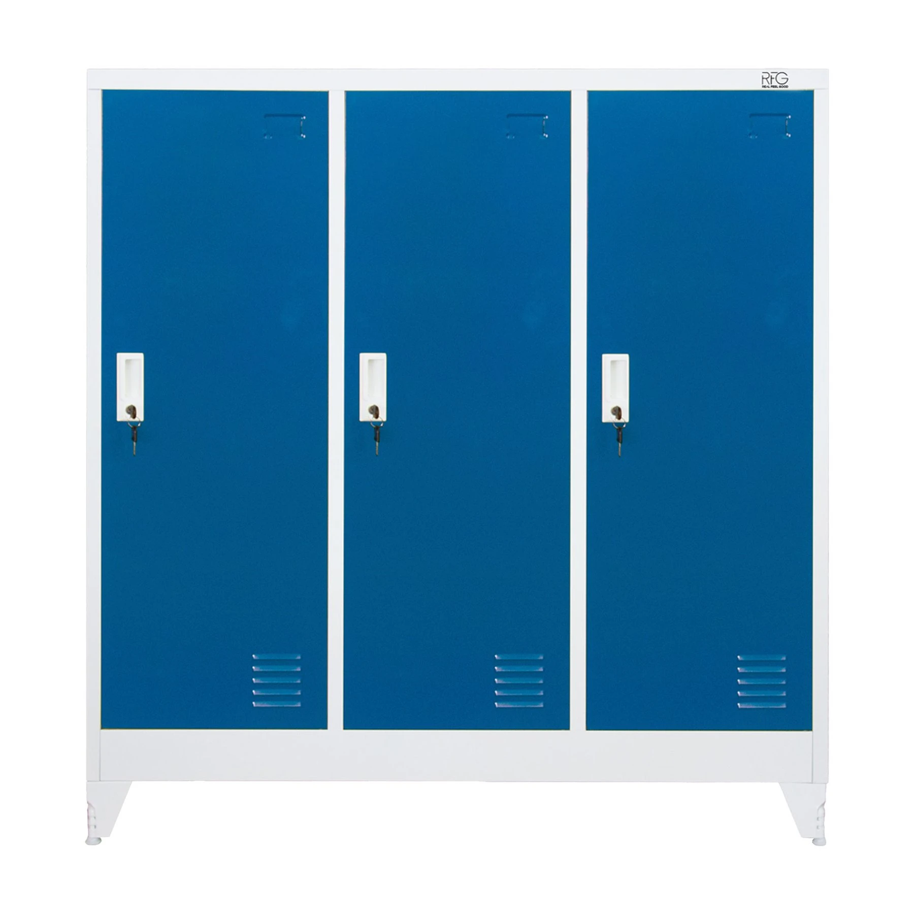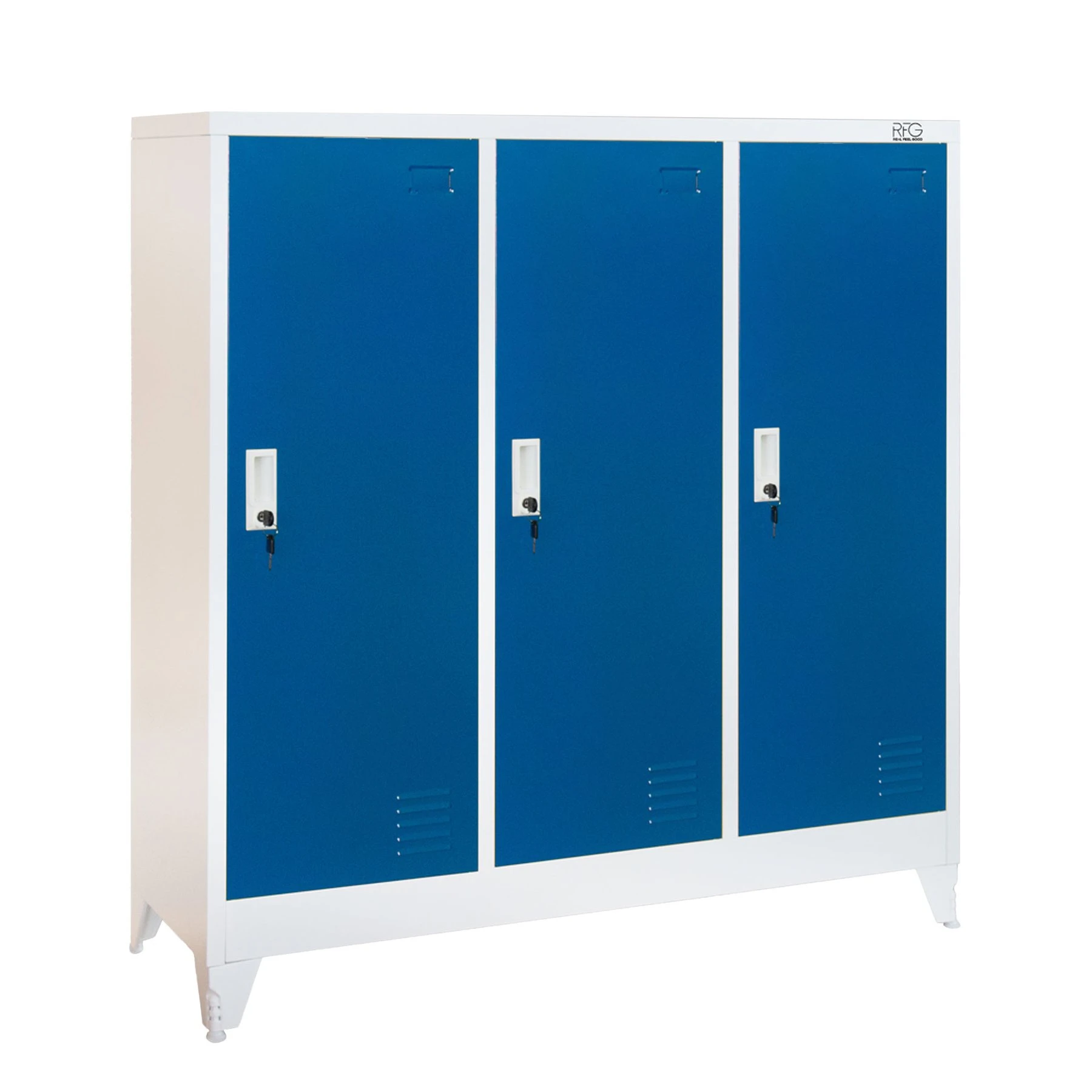 Гардероб RFG, метален, троен, с три врати, 120 х 40 х 120 cm, бял, със сини врати