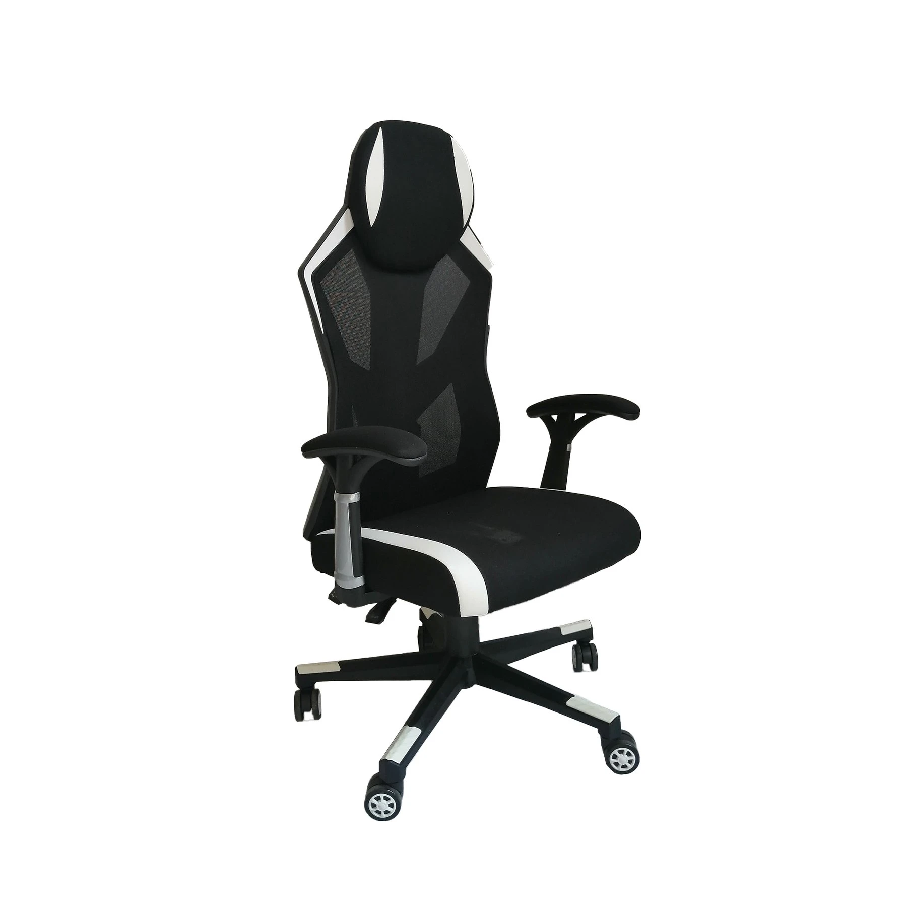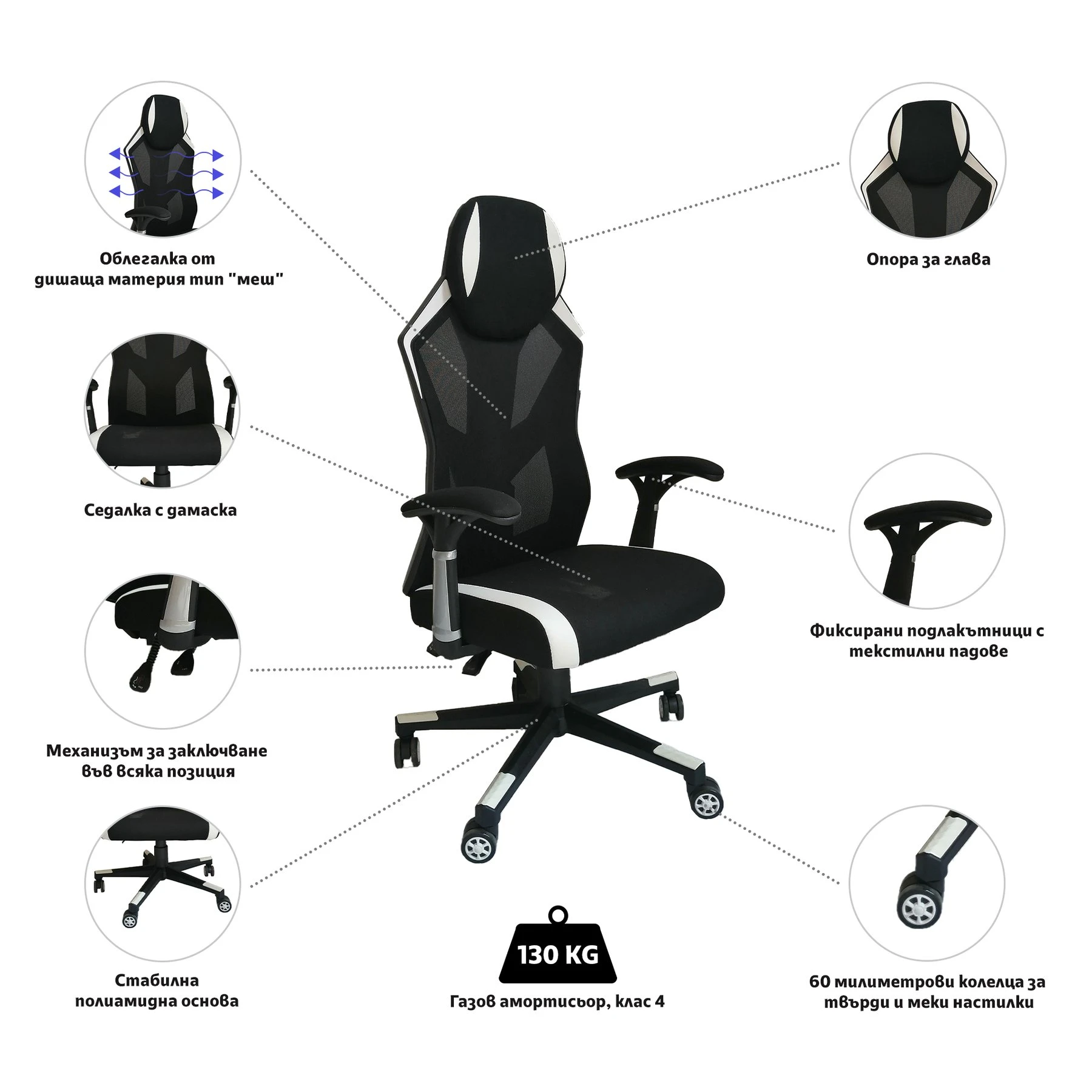 Геймърски стол RFG Soft Game, дамаска и меш, полиамидна основа, до 130 kg, черно-бял