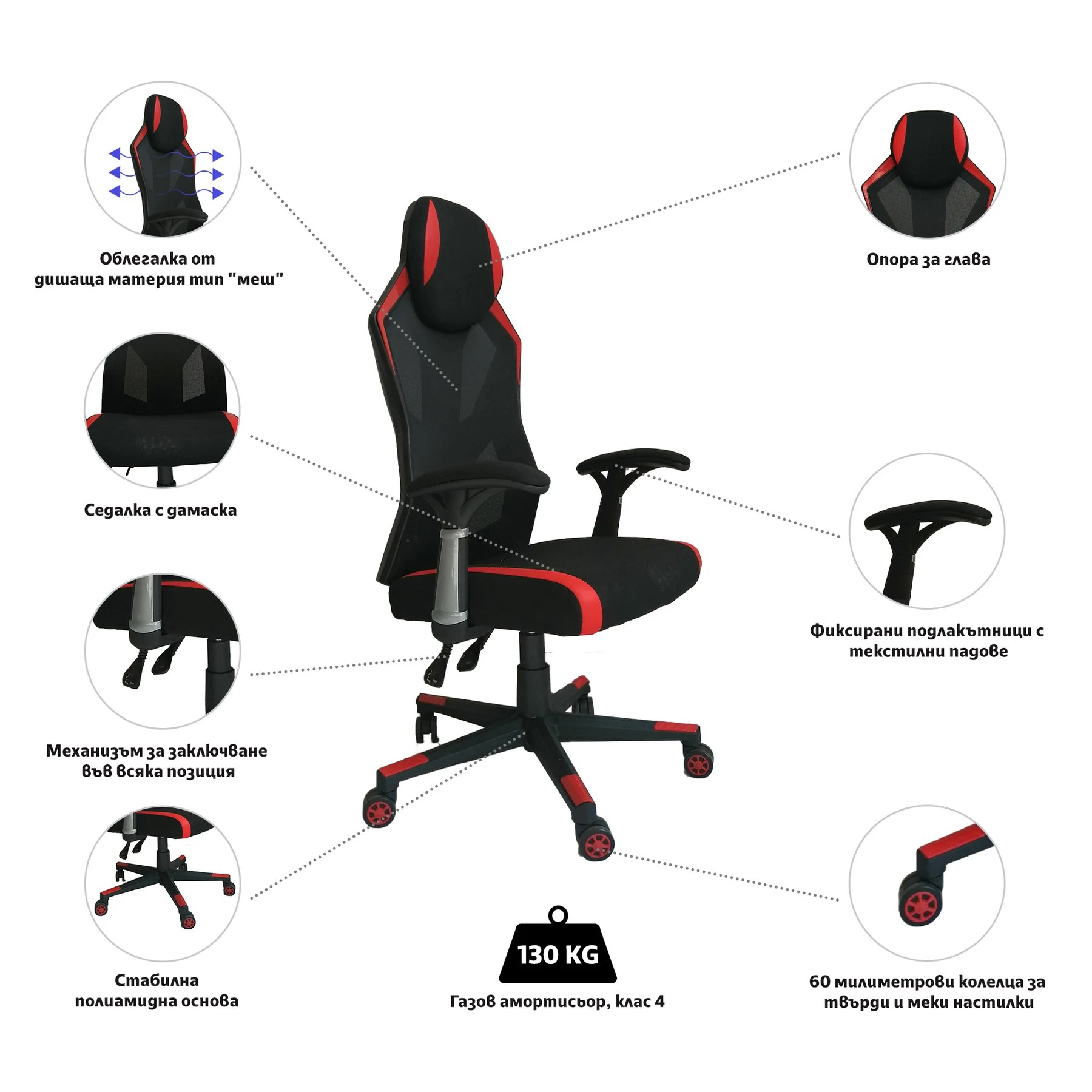 Геймърски стол RFG Soft Game, дамаска и меш, полиамидна основа, до 130 kg, черно-червен