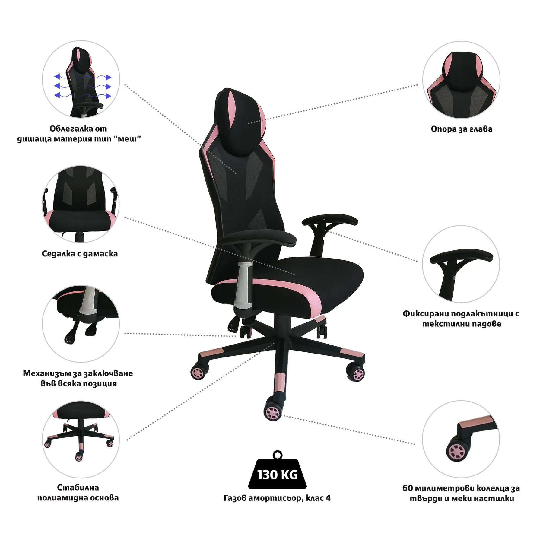 Геймърски стол RFG Soft Game, дамаска и меш, полиамидна основа, до 130 kg, черно-розов