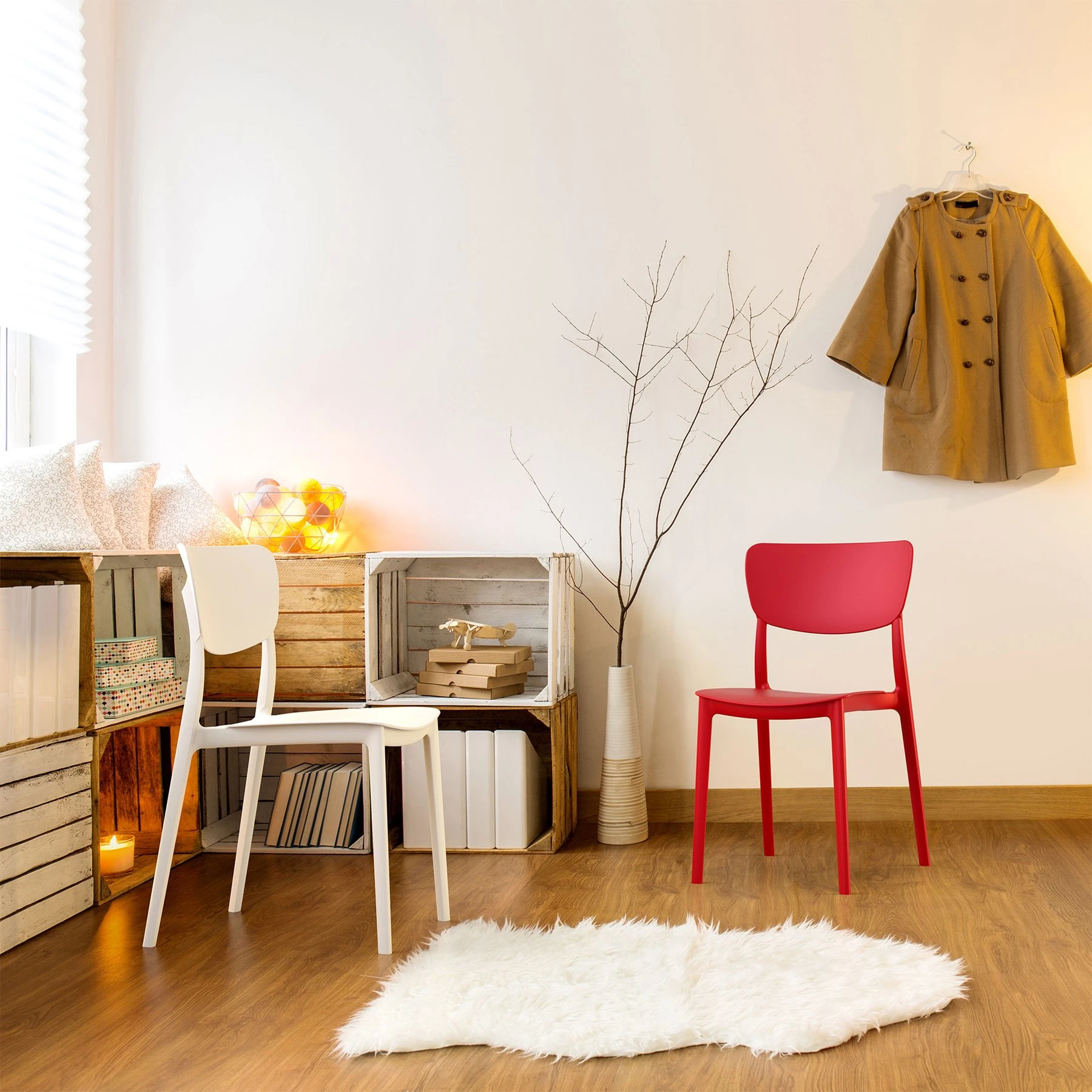 Въздушно формоване Стол Moon e подсилен със стъклени влакна, получени с помощта на най-ново поколение технология за въздушно формоване, а облегалката е в прозрачен поликарбонат.