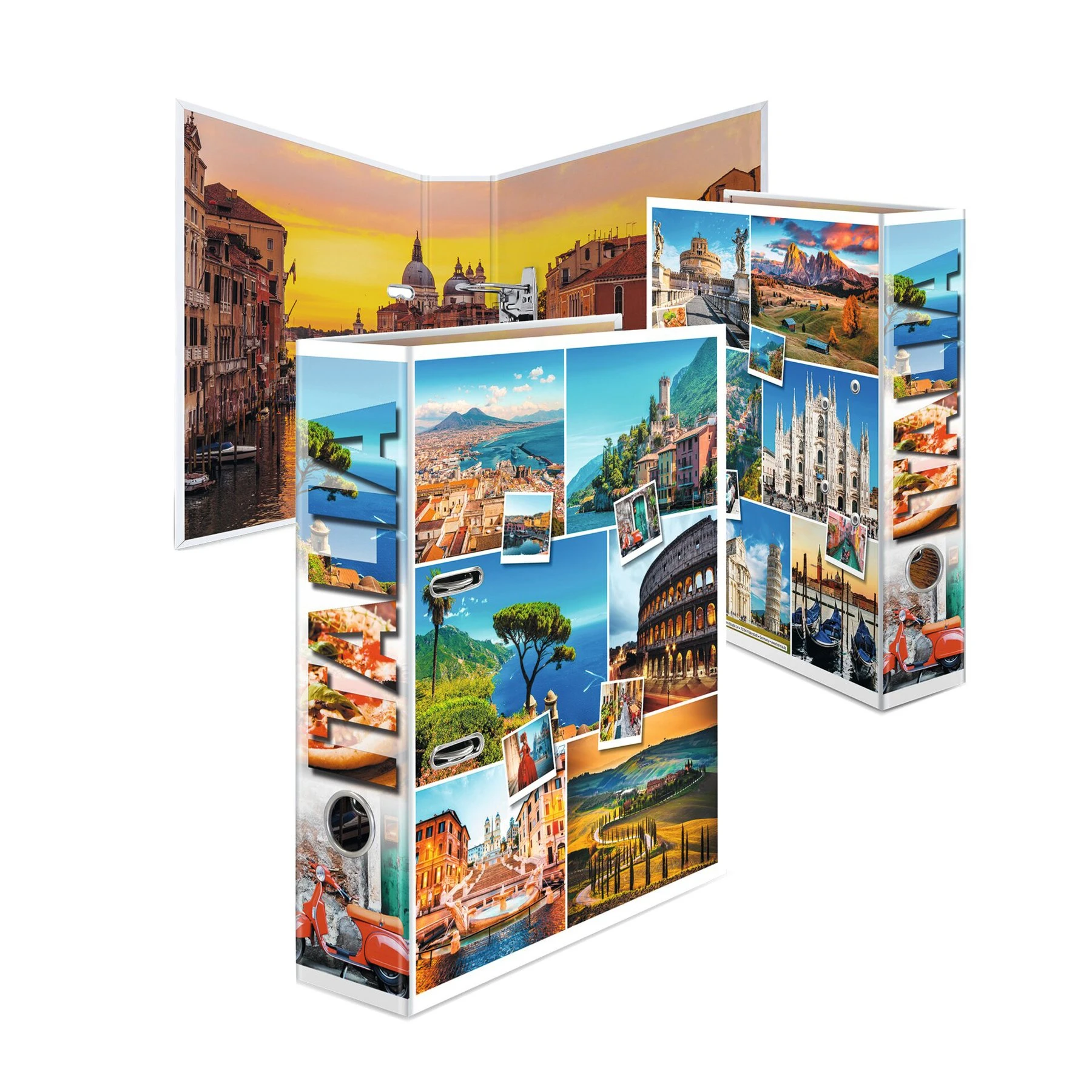Класьор за документи „Италия“, отпечатан с много цветни снимки от Италия, впечатляващи пейзажи, модерни и исторически градове, живописни плажове и културни сгради.