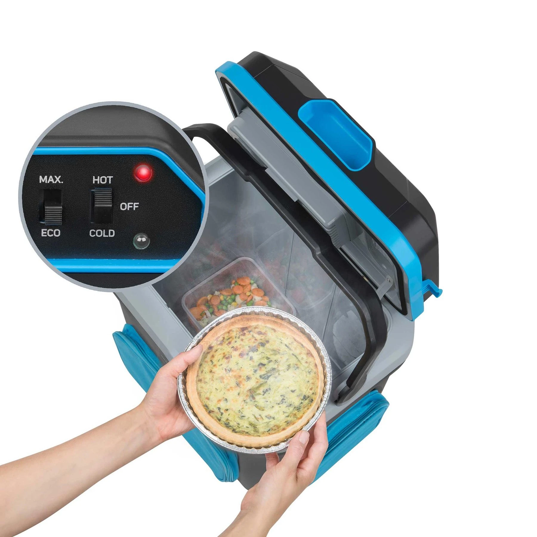 Чантата може не само да охлажда, но и да отоплява. Охлажда до 16°C под температурата на околната среда или загрява до 60 °C. Изпълняваната програма се осветява с цветен светодиод.