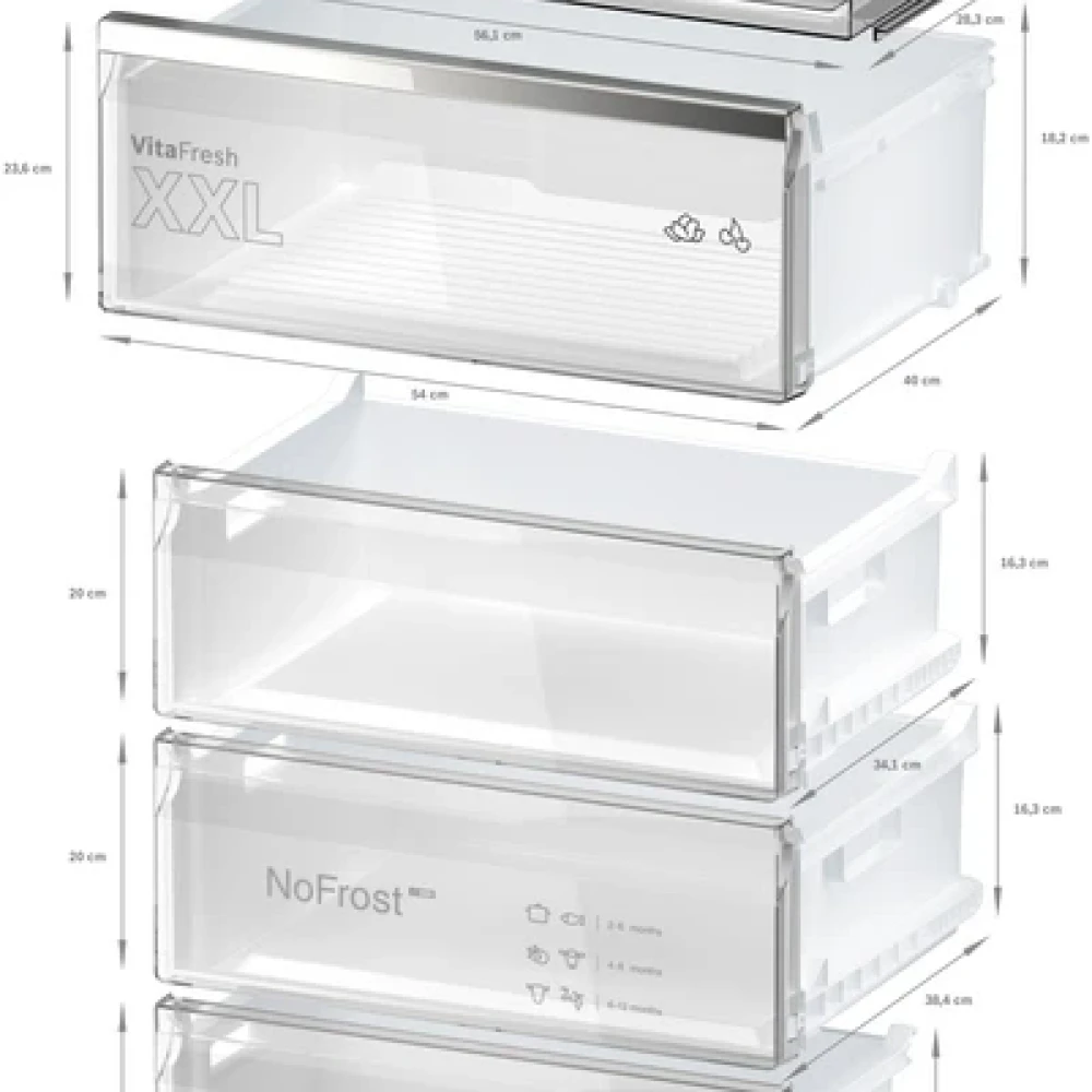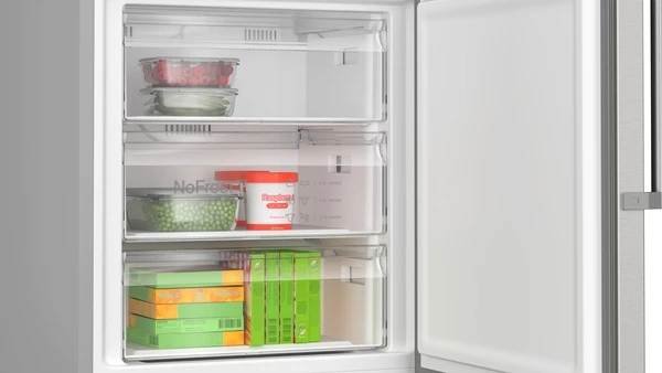 Total NoFrost: Край на размразяването на фризера и без капки вода по задната стена на хладилника. С технологията Total No Frost никога повече няма да се налага да размразявате фризера си. Тя извлича влагата и поддържа въздуха сух, като предотвратява образуването на лед по стените и храната ви. Това важи и за зоната на хладилника. Кажете сбогом на водните капки и образуването на лед по задната стена. Това не само ви спестява неприятностите, свързани с размразяването и почистването, но и прави уреда ви по-енергийно ефективен.