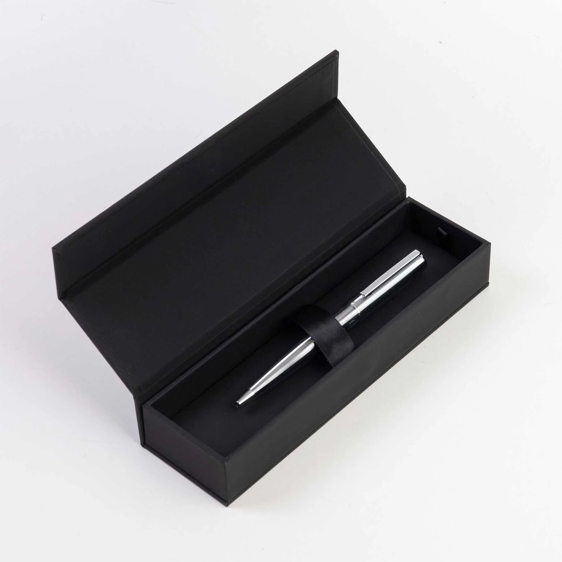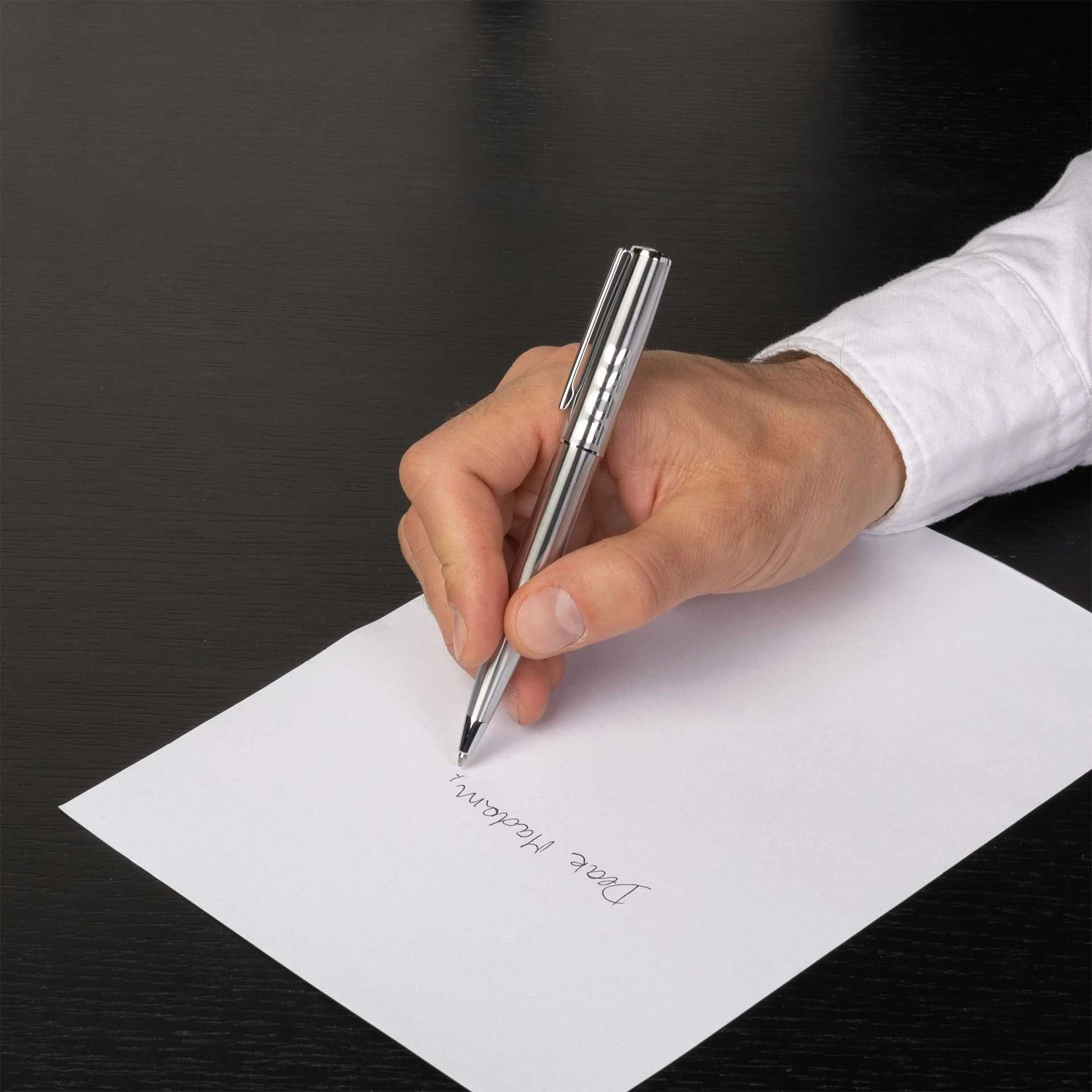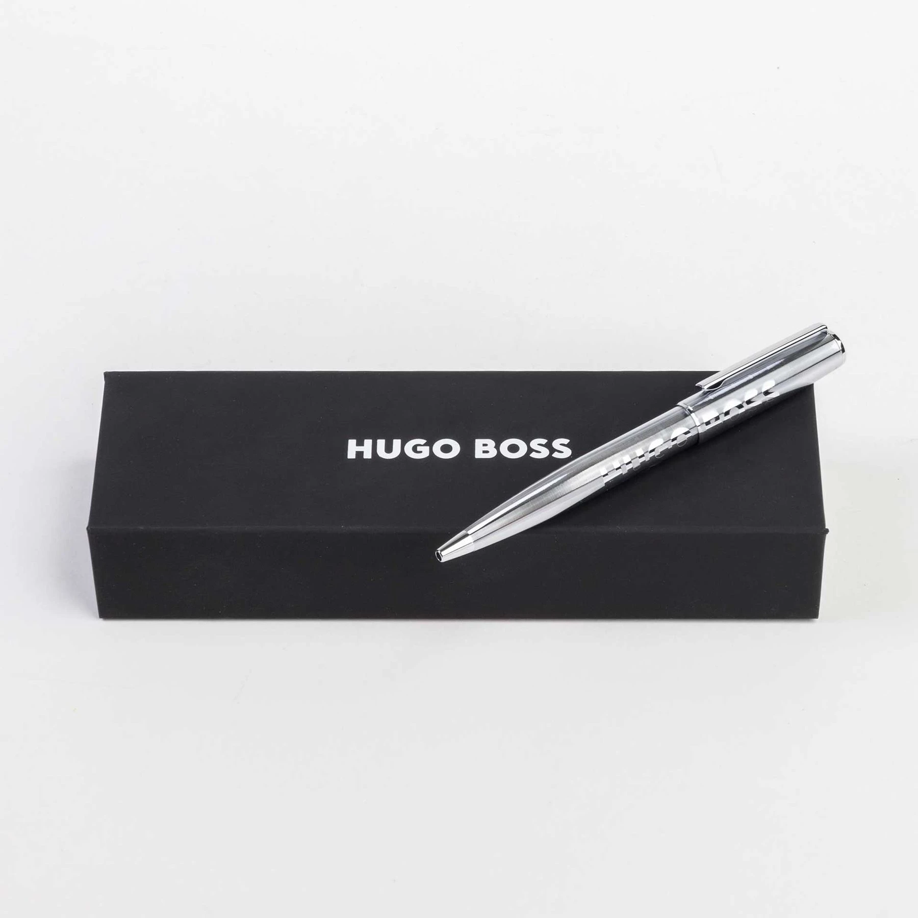 Химикалката се отличава с красивия си сребърен корпус, по който е гравирано логото Hugo Boss.