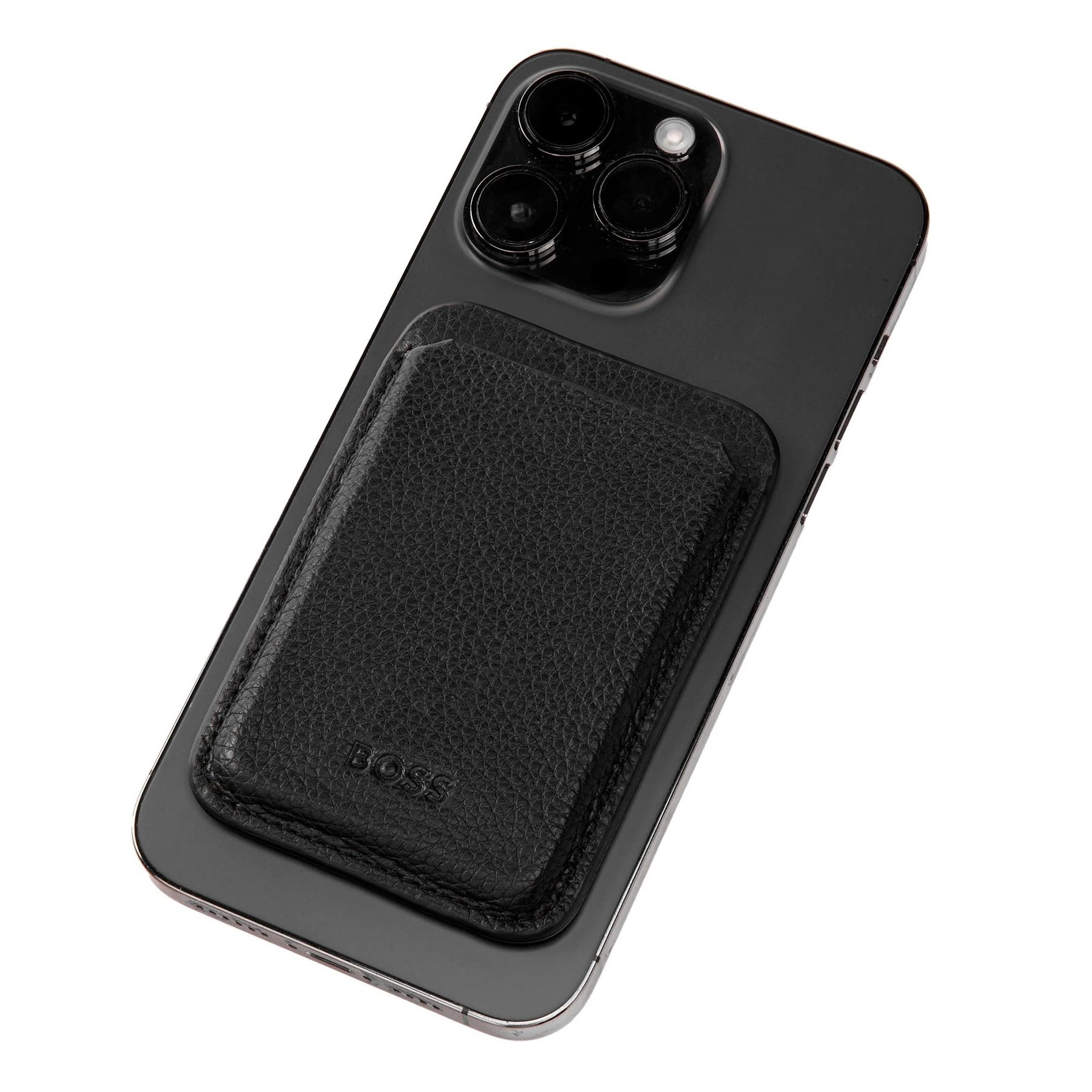 Калъф за карти с MagSafe от серията Classic Grained на Hugo Boss. Калъфът може да се залепи за всеки телефон, който разполага с MagSafe. Тази колекция Classic Grained се отличава с красива черна текстурирана кожа и е фино щампована с логото на BOSS. Завършващият щрих е подплата с монограм, която добавя още един фин елемент на марката.
