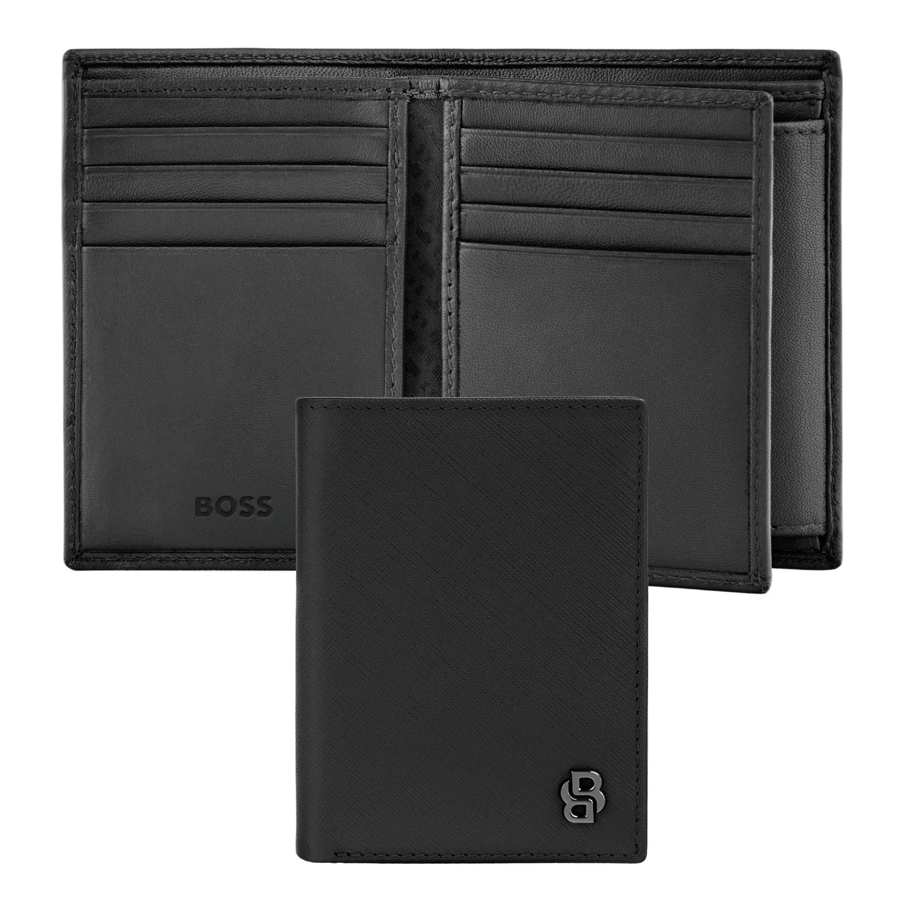 Линията е създадена от висококачествена естествена кожа с фина сафияно текстура в матово изпълнение, която придава изтънчен и модерен луксозен вид. Всеки артикул е прецизно изработен и завършен с новата метална плочка Double B в дълбоко gunmetal покритие — отличителен, съвременен подпис на серията. В духа на BOSS моделът е семпъл, функционален, елегантен и минималистичен.