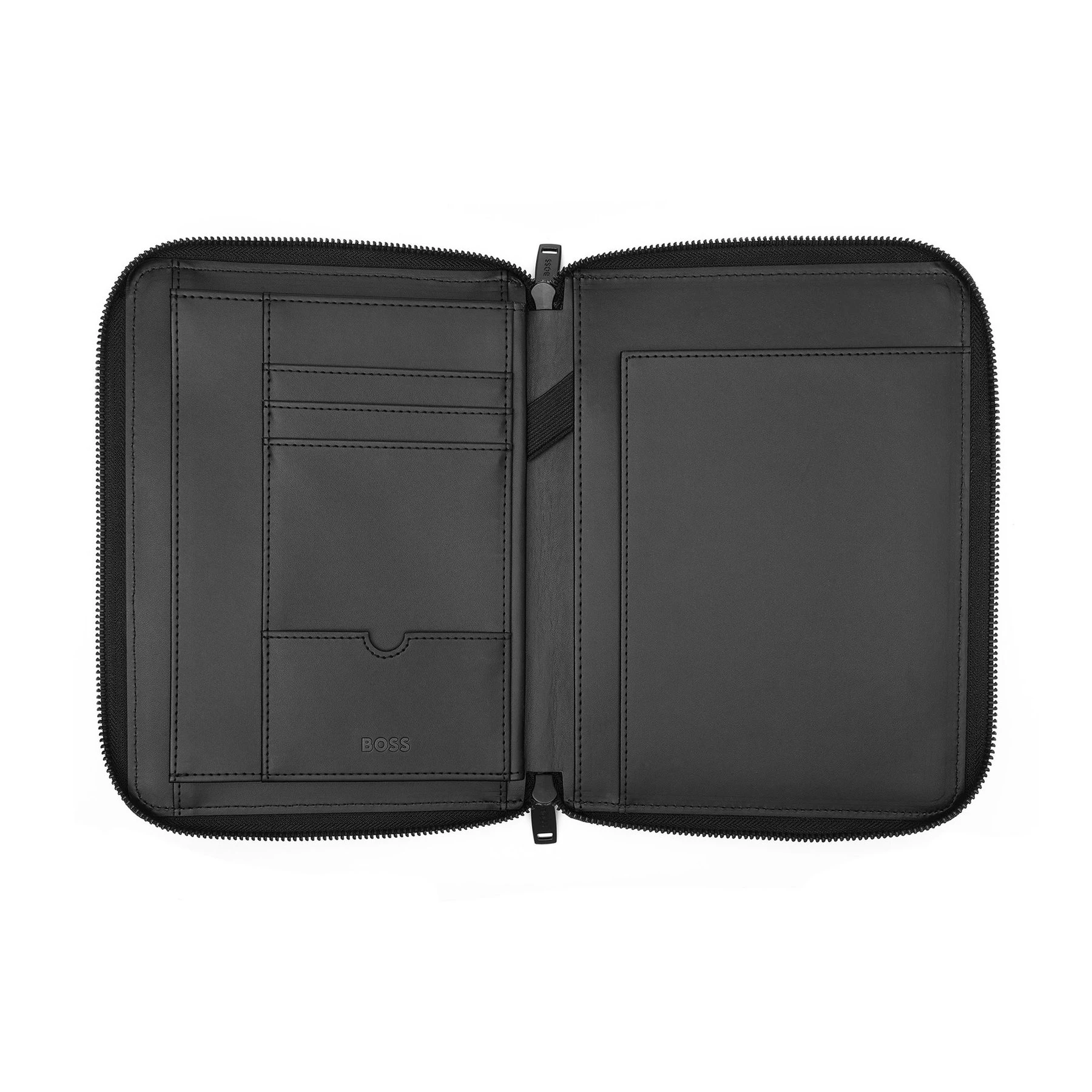 Отвътре папката има множество джобове за документи и слотове за карти.