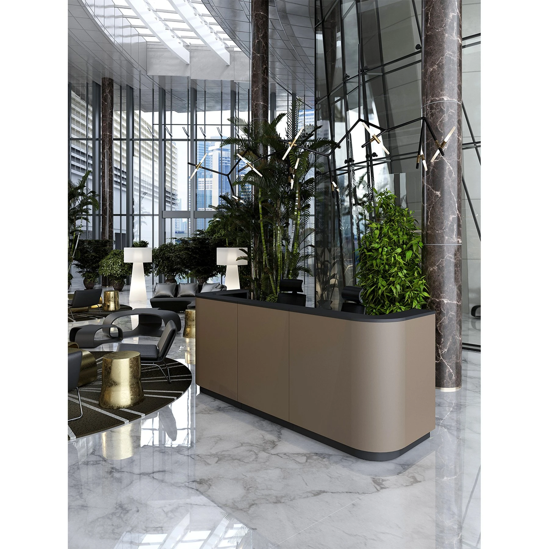 Извит десен модул за рецепция, изработен от ПДЧ с меламиново покритие и HPL детайли.