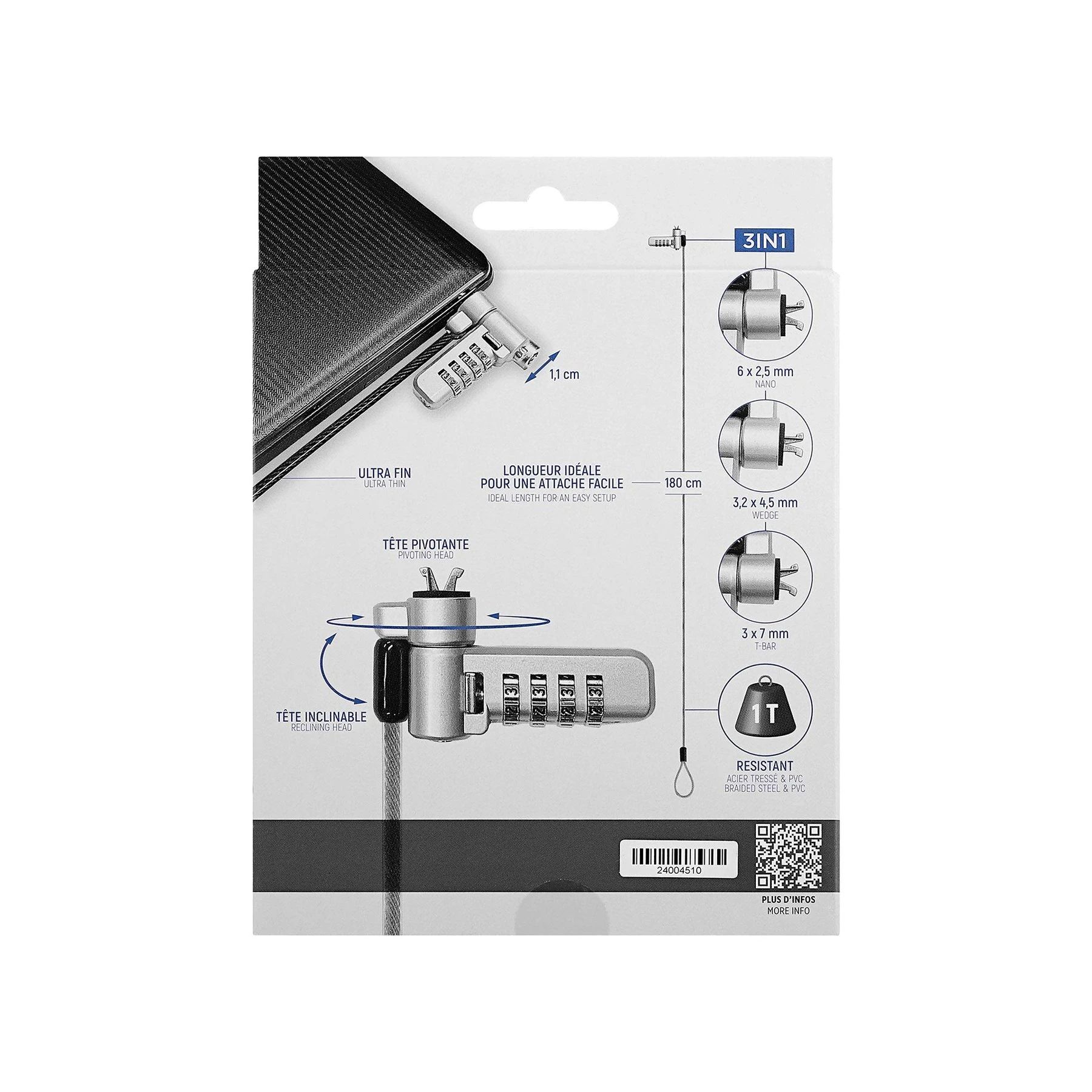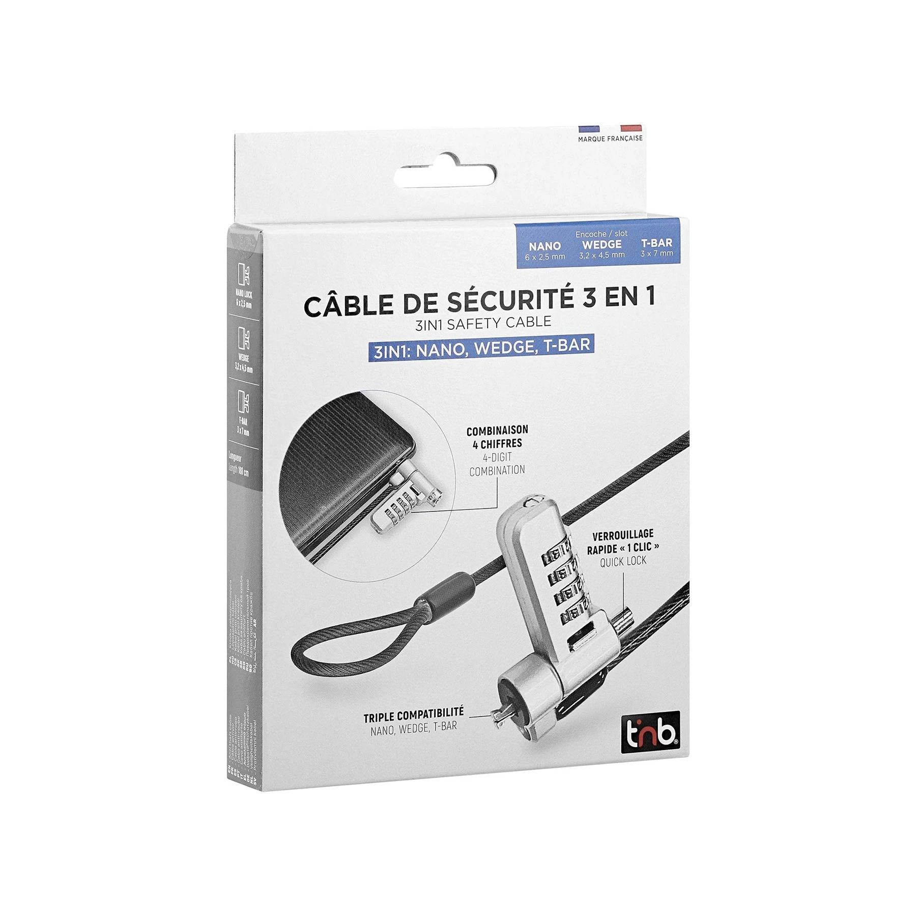 Кабел за заключване TNB Tbar, с код, 3 в 1, дължина 1.8 m