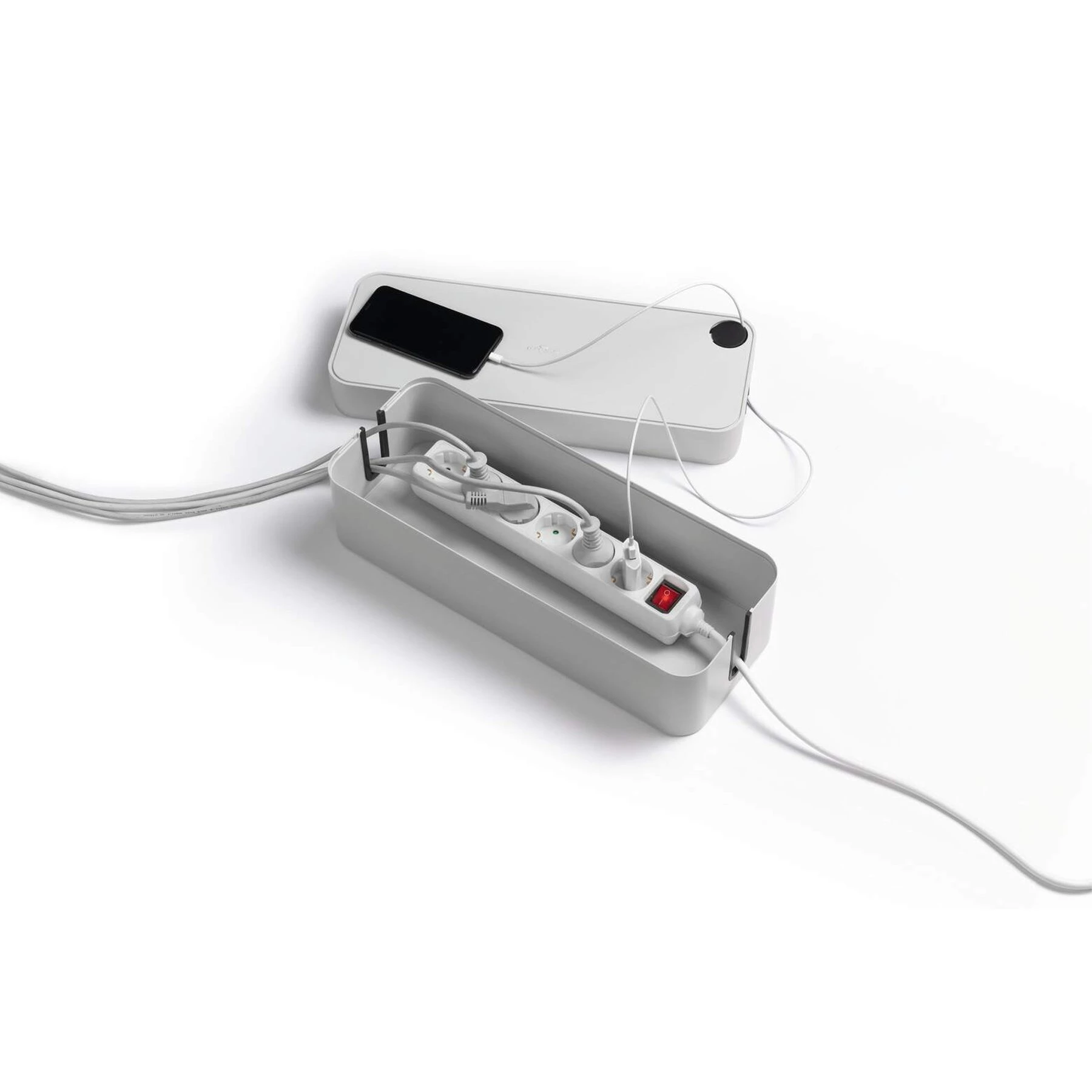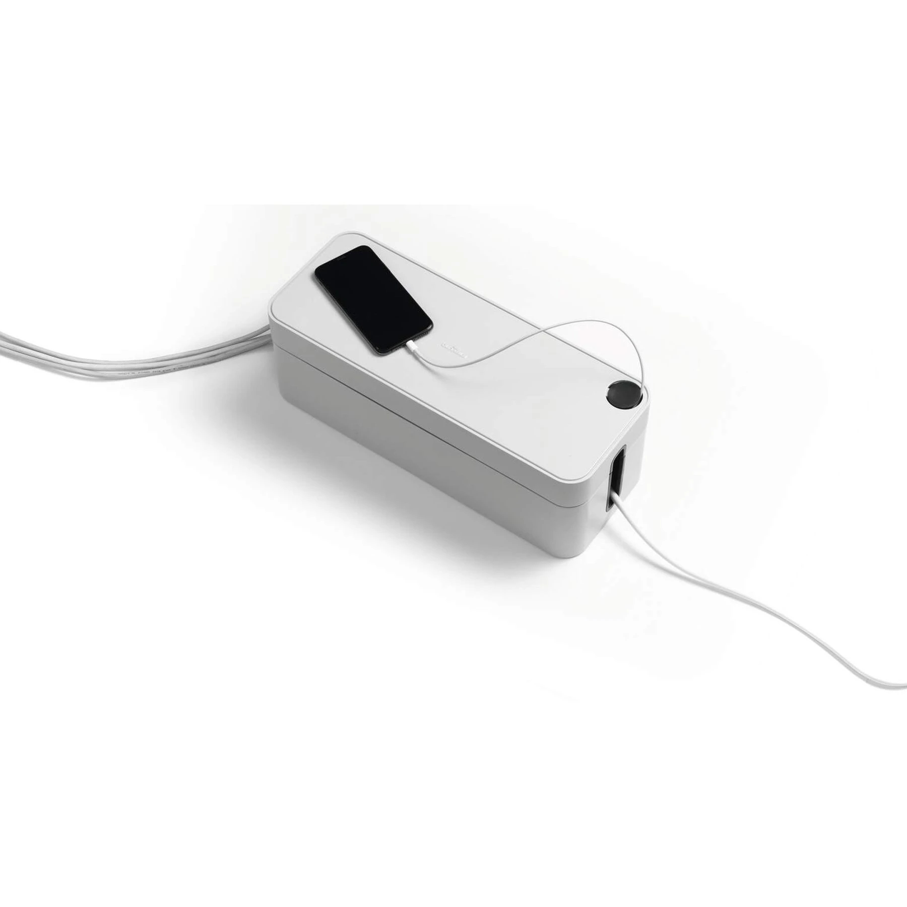 Кабелна кутия за задържане на кабели и разклонител с 5 гнезда.