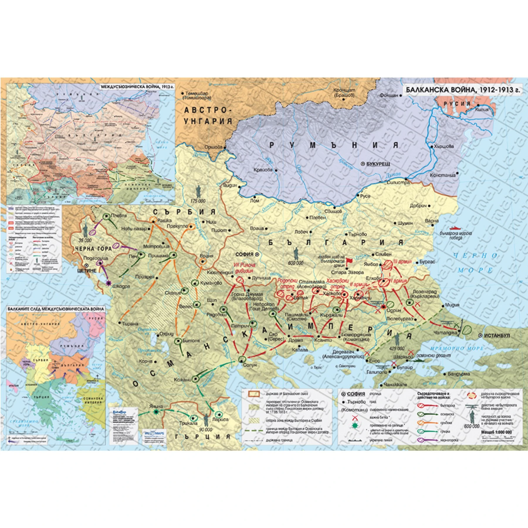 Съдържа: географска мрежа; хидрография; територия на Османската империя, държавите от Балканския съюз, спорни зони, и др. територии, представени чрез фоново оцветяване или щриховка върху сенкорелеф; райони на съсредоточаване на войски, държавни граници; граница между България и Османската империя според Лондонския мирен договор; действия на българската, гръцката, сръбската и черногорската войска; битки; укрепена линия; действия на българската бойна авиация; численост на войските, столици и градове; турски крепости; надписи на хидрография, държави и други.