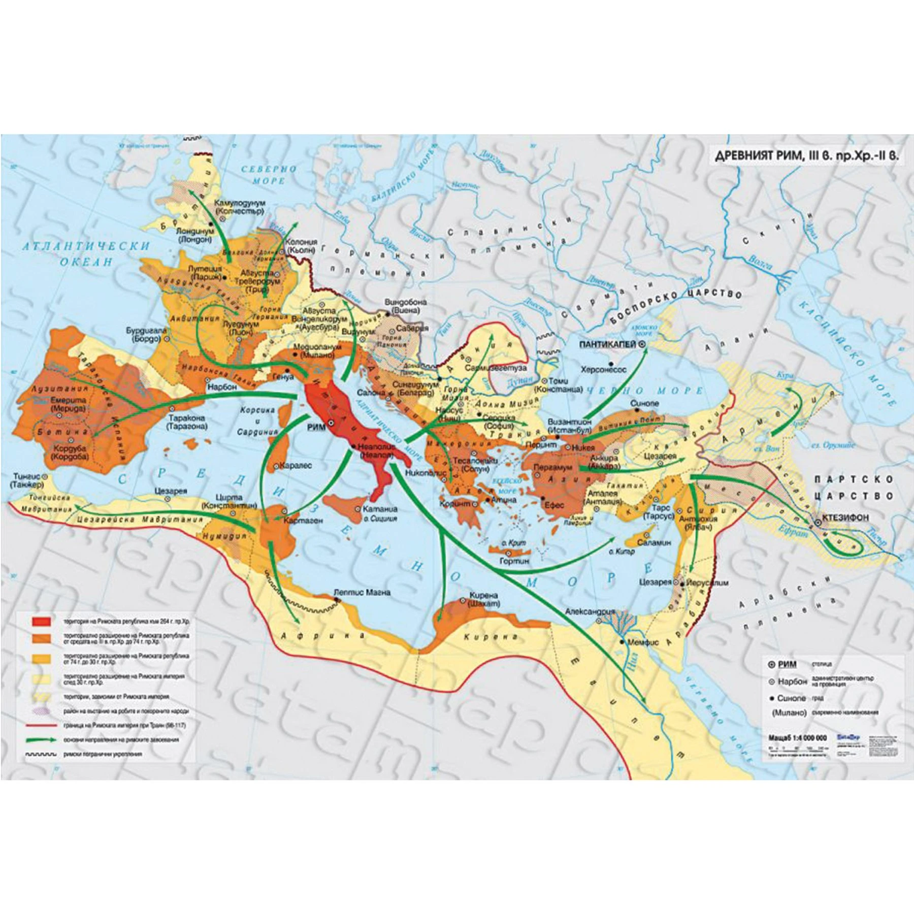 Карта древен Рим, изобразяваща географска мрежа; хидрография; територия на Римската република през 264 г. пр.Хр., териториални разширения на Римската република, териториално разширение на Римската империя след 30 г. пр.Хр., територии зависими от Римската империя, райони където робите и покорените народи са въставали; граница на Римската империя при Траян; основни направления на римските завоевания; римски погранични укрепления; столици, административни центрове на провинции и градове; надписи на хидрография, историко-географски области, племена и други.