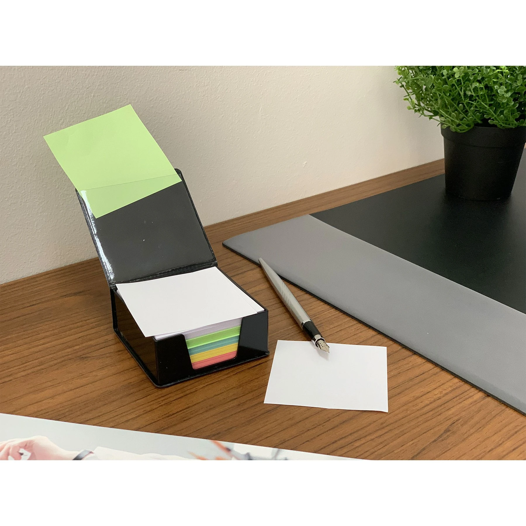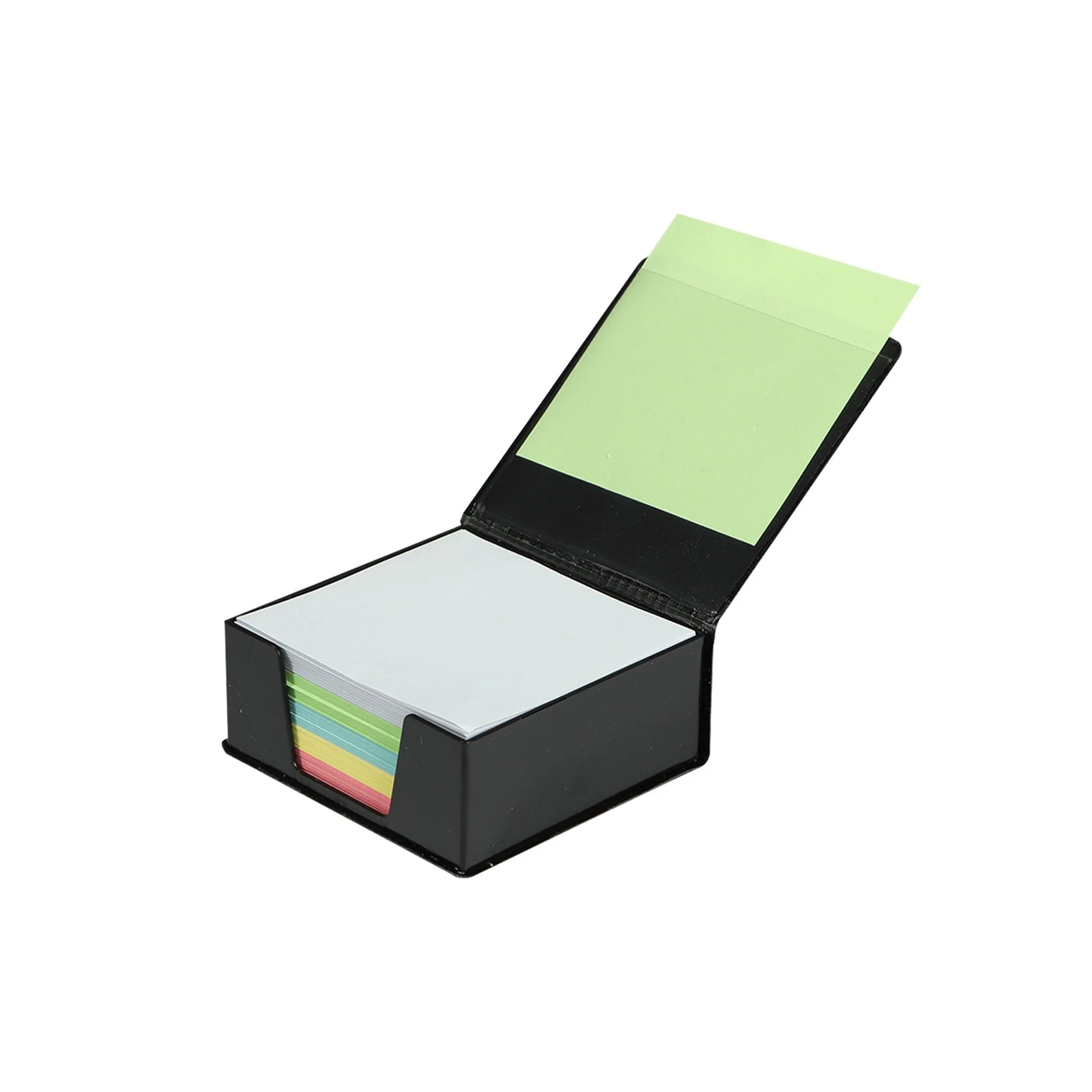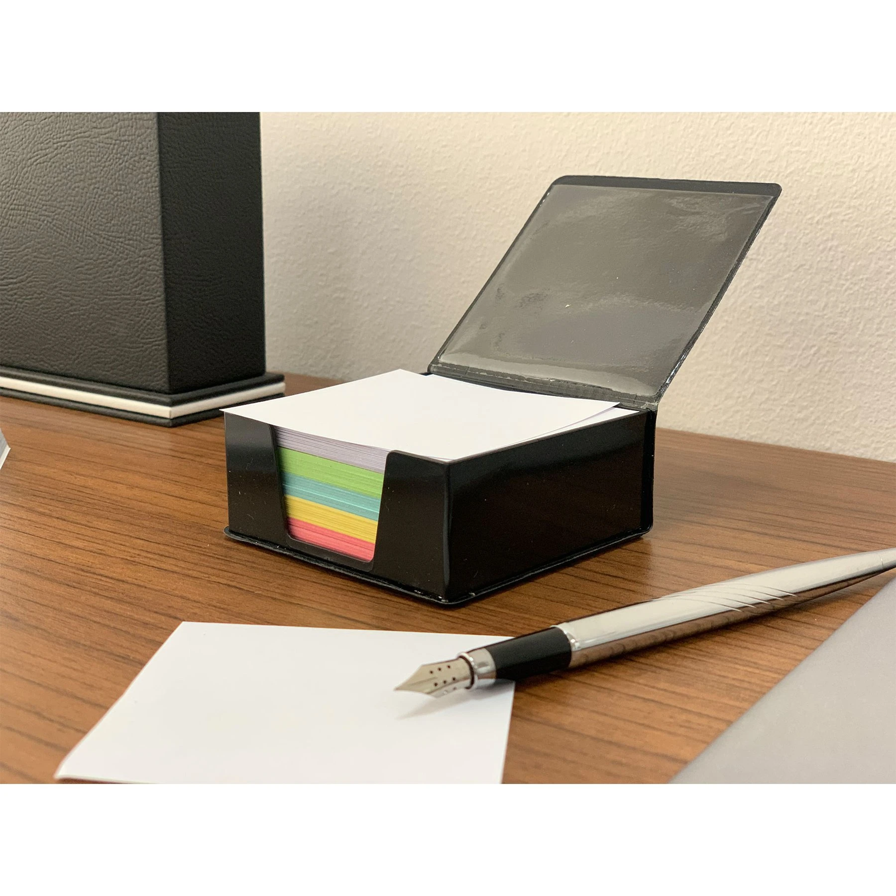Хартиено кубче с цветни листа и елегантна черна кожена поставка с капак.