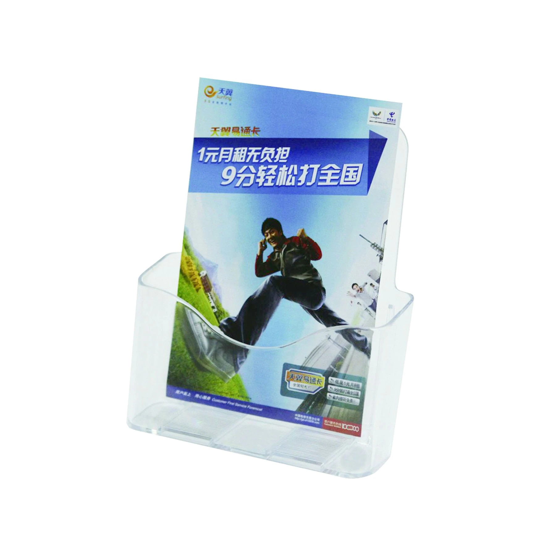 Поставката за брошури е изключително практично решение за поставяне на рекламните материали, брошури, флаери дипляни и други. Намира широко приложение в чакални, фоайета, рецепции, конферентни зали и други. Поставката е изработена от издръжлив PS материал, с дебелина около 4 mm.