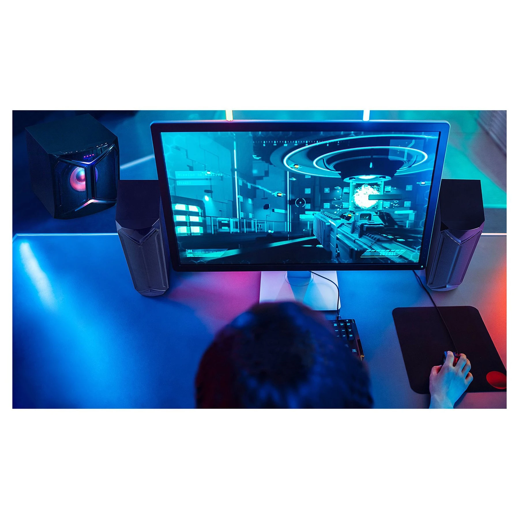 Наслаждавайте се на музика, игри или филми и подобрете аудио изживяването с мултимедийната система от 2.1 високоговорителя с изходна мощност 50 W RMS.