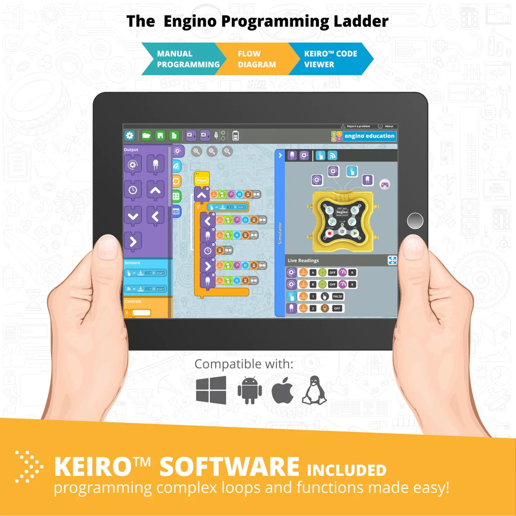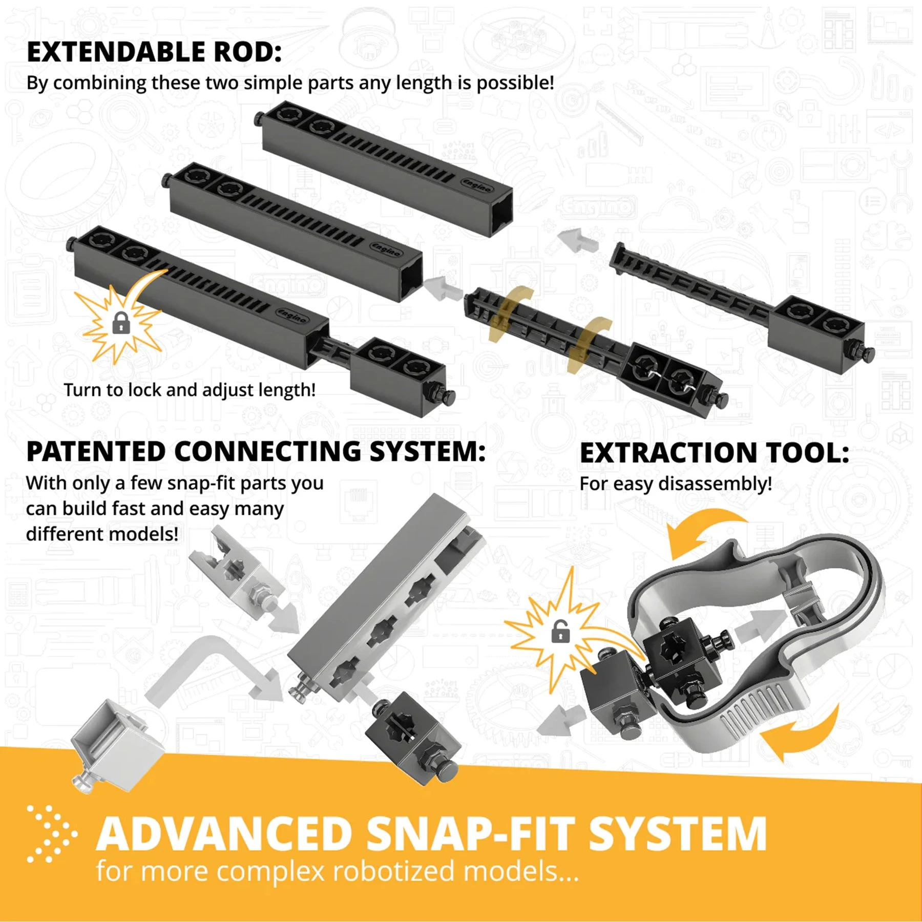 Допълнителните технически части ENGINO® позволяват конструирането на 40 сложни модела, които са снабдени с теория и експериментални дейности, за да обхванат не само инженерния дизайн, но и кодирането, механиката и природните науки.