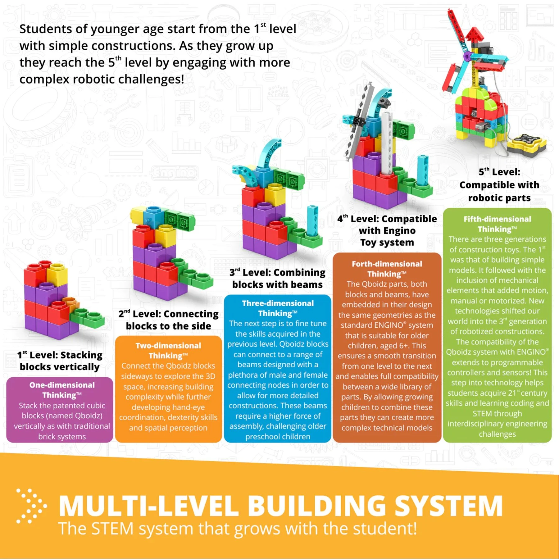 Има две поколения роботизирани модели, които могат да се правят с този комплект. По-прости модели, използващи частите Qboidz, които имат за цел да въведат кодирането при по-малките ученици, и сложни модели с класическите части ENGINO® за по-напреднали модели.