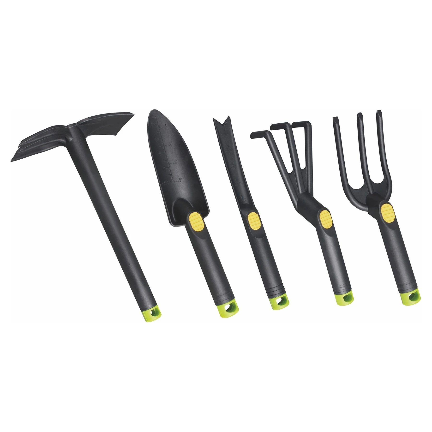 Комплект от градински инструменти за обработване на почвата, включващ копачка, лопатка, лопатка за плевене, гребло и вилица.