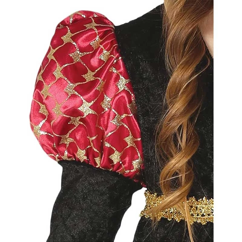 Комплектът включва дълга виненочервена средновековна рокля с буф ръкави и златисти декорации.