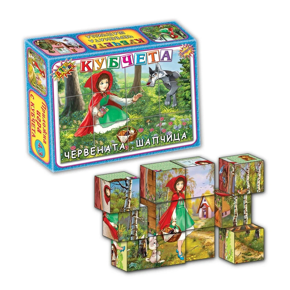 Комплектът кубчета "Червената шапчица" съдържа 12 броя кубчета с размер 4 x 4 cm.