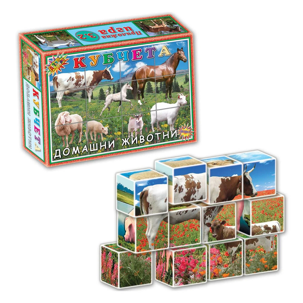 12 броя кубчета в комплект с общо 6 картинки с животни за подреждане.