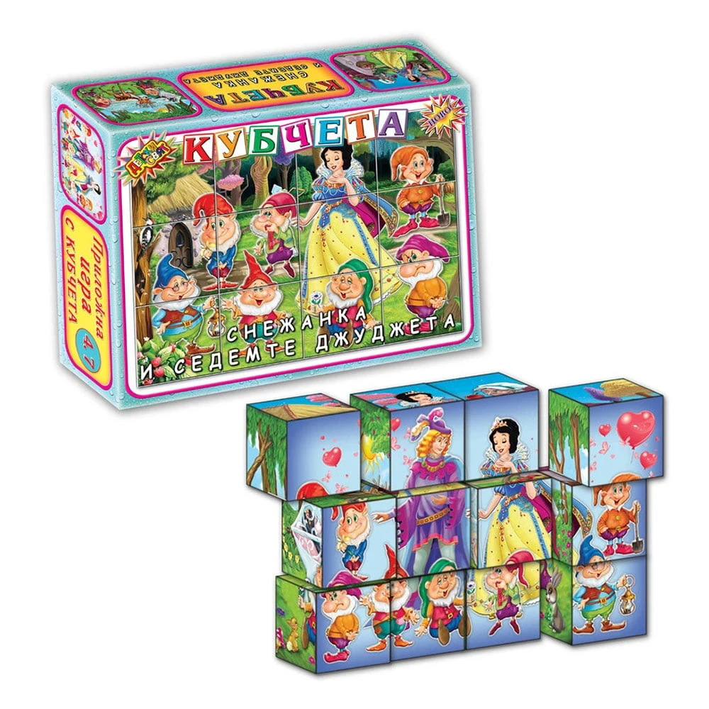 Комплектът кубчета "Снежанка и седемте джуджета" съдържа 12 броя кубчета с размери 4 x 4 cm.