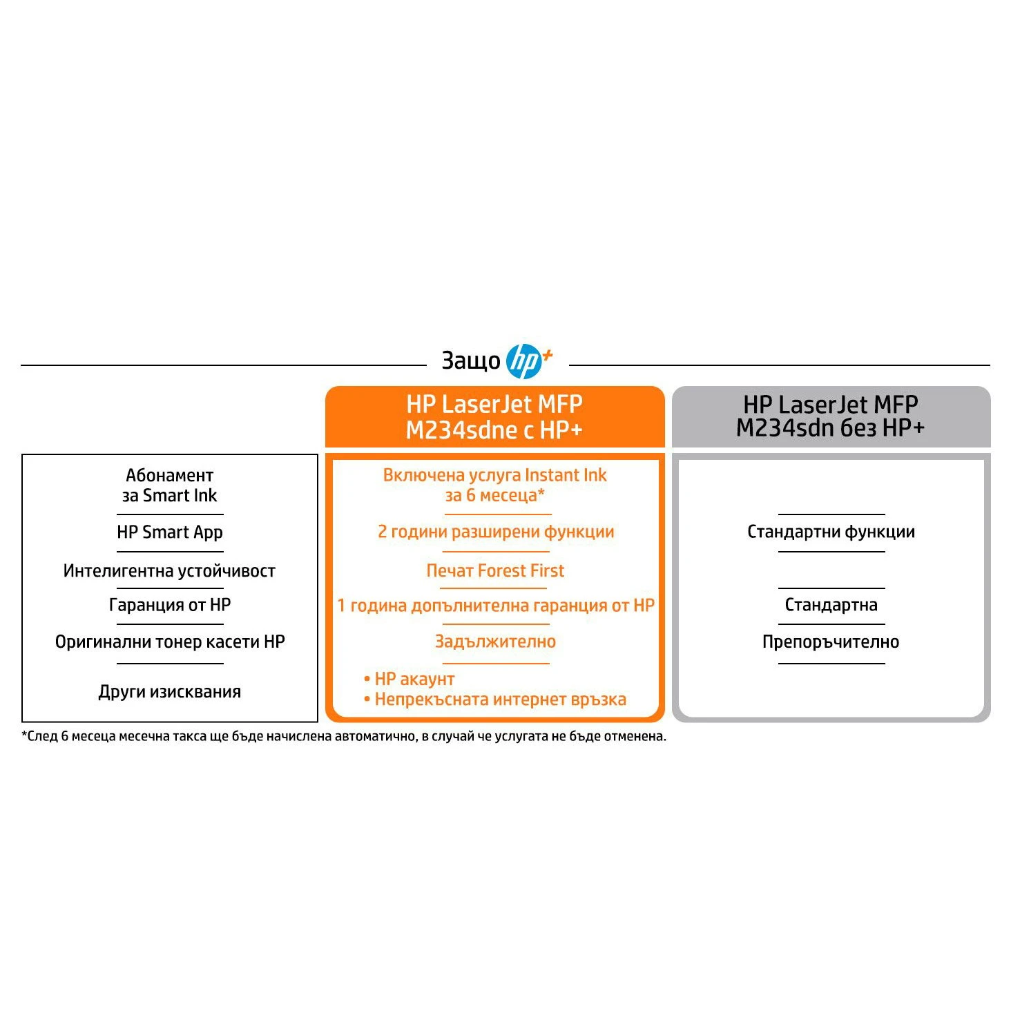 Този принтер HP+ се предлага с 6 месеца ползване на Instant Ink и удължаване на гаранция от HP с 1 година. След като изтекат 6 месеца на Instant Ink, автоматично ще бъде начислена месечна такса, освен ако услугата не бъде прекратена.