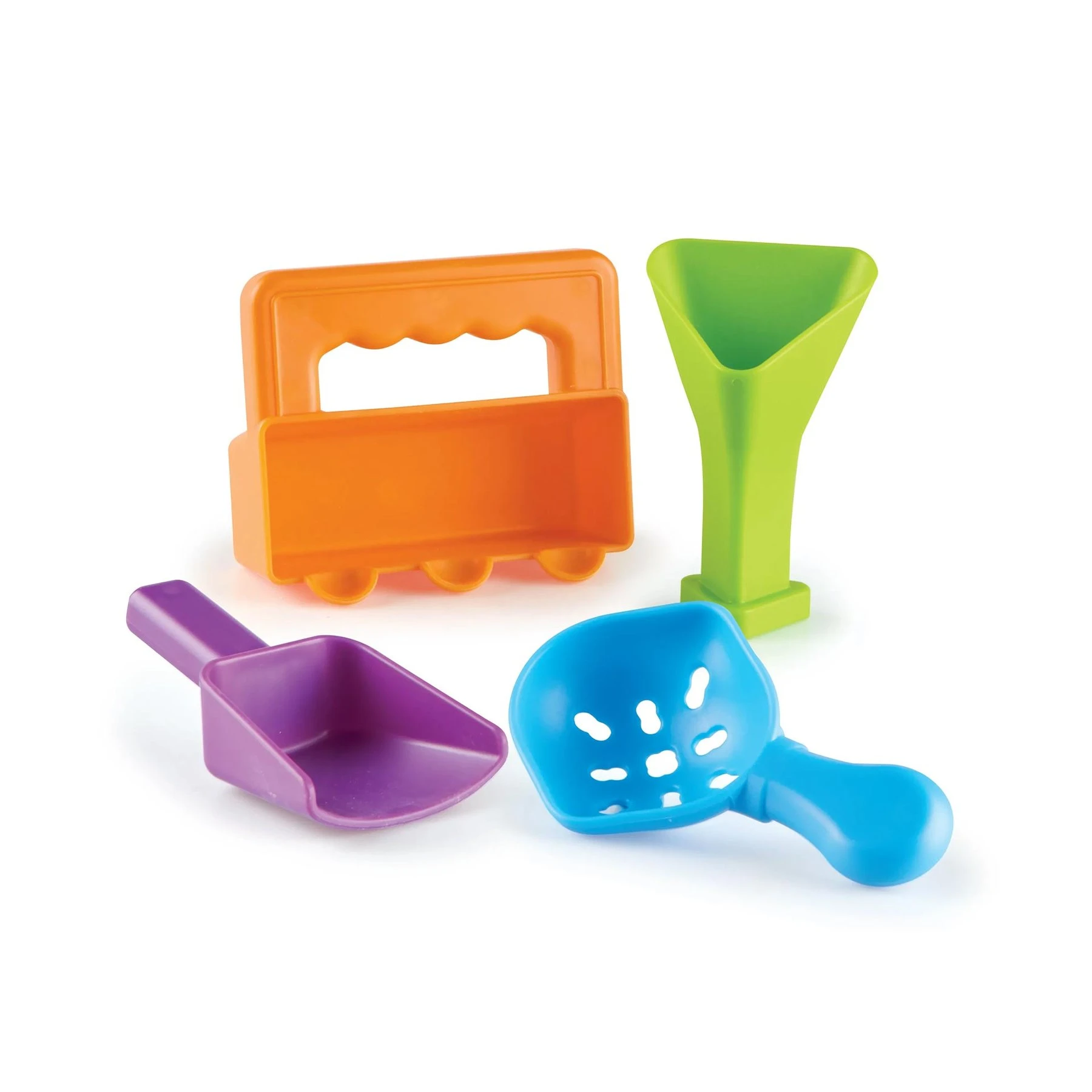 Този комплект включва 4 цветни и здрави инструмента, всеки с различна функция: загребване, въртене, пресяване и изливане. Идеален е за игра с пясък, вода, ориз, брашно и други сензорни материали както у дома, така и в класната стая.