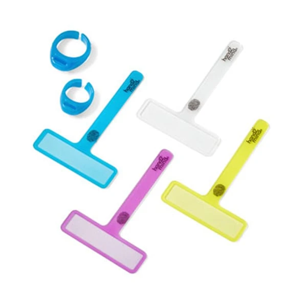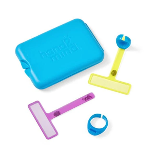 Комплектът включва: 2 регулируеми пръстена (1 малък, 1 голям), 4 взаимозаменяеми цветни пръчици за маркиране (сини, розови, жълти и прозрачни) в удобен калъф тип мида.