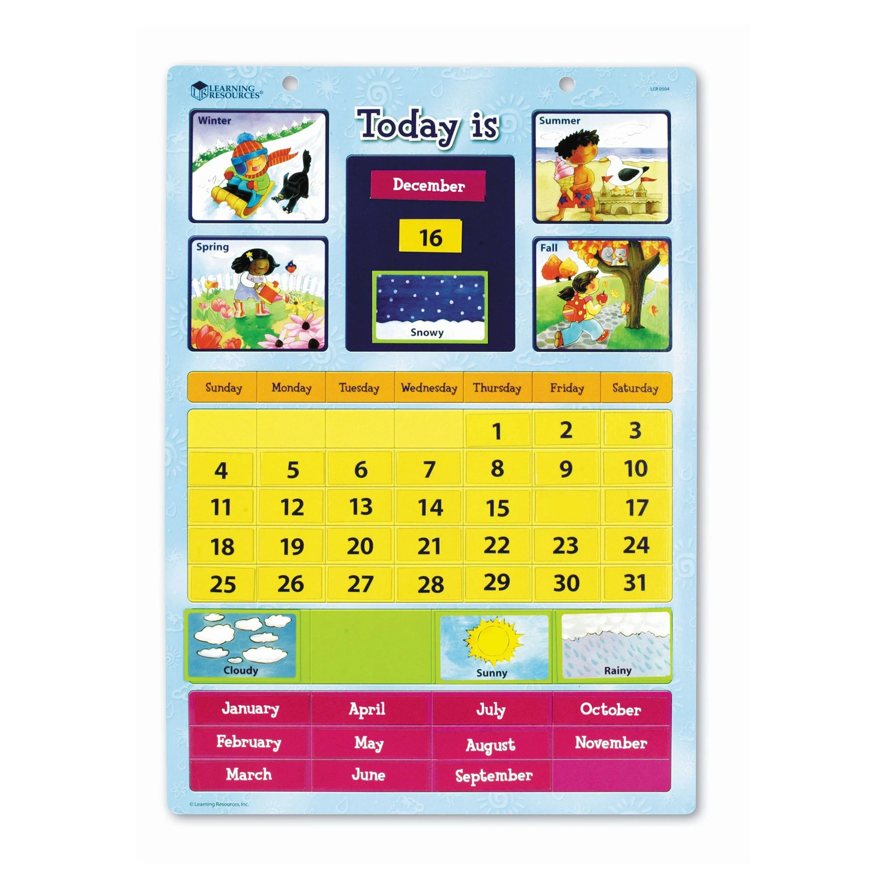 Магнитният календар за времето и сезоните помага за научаване на понятията за ден, седмица, месец, година и сезони.