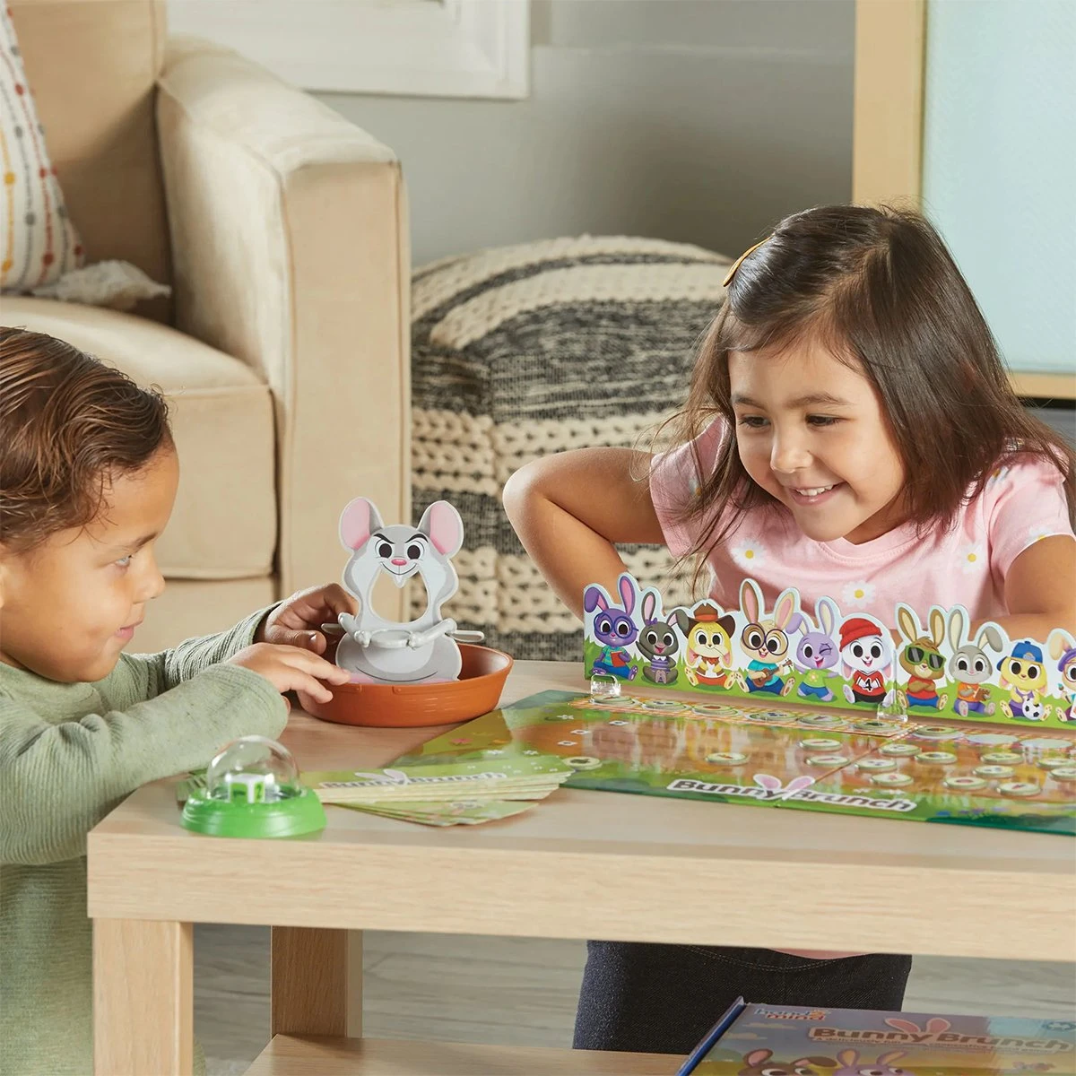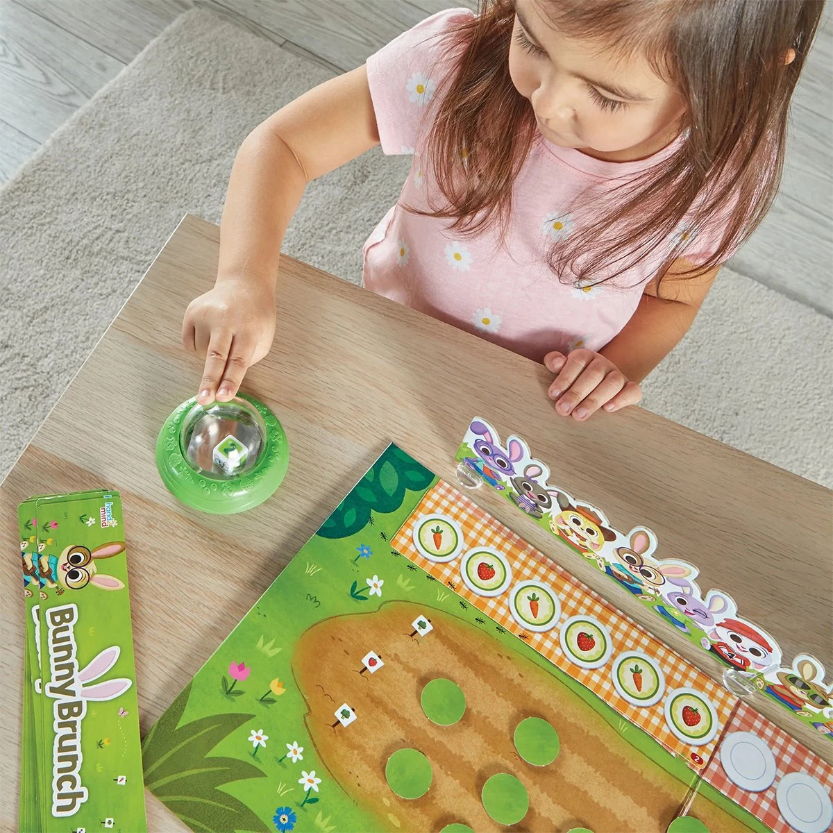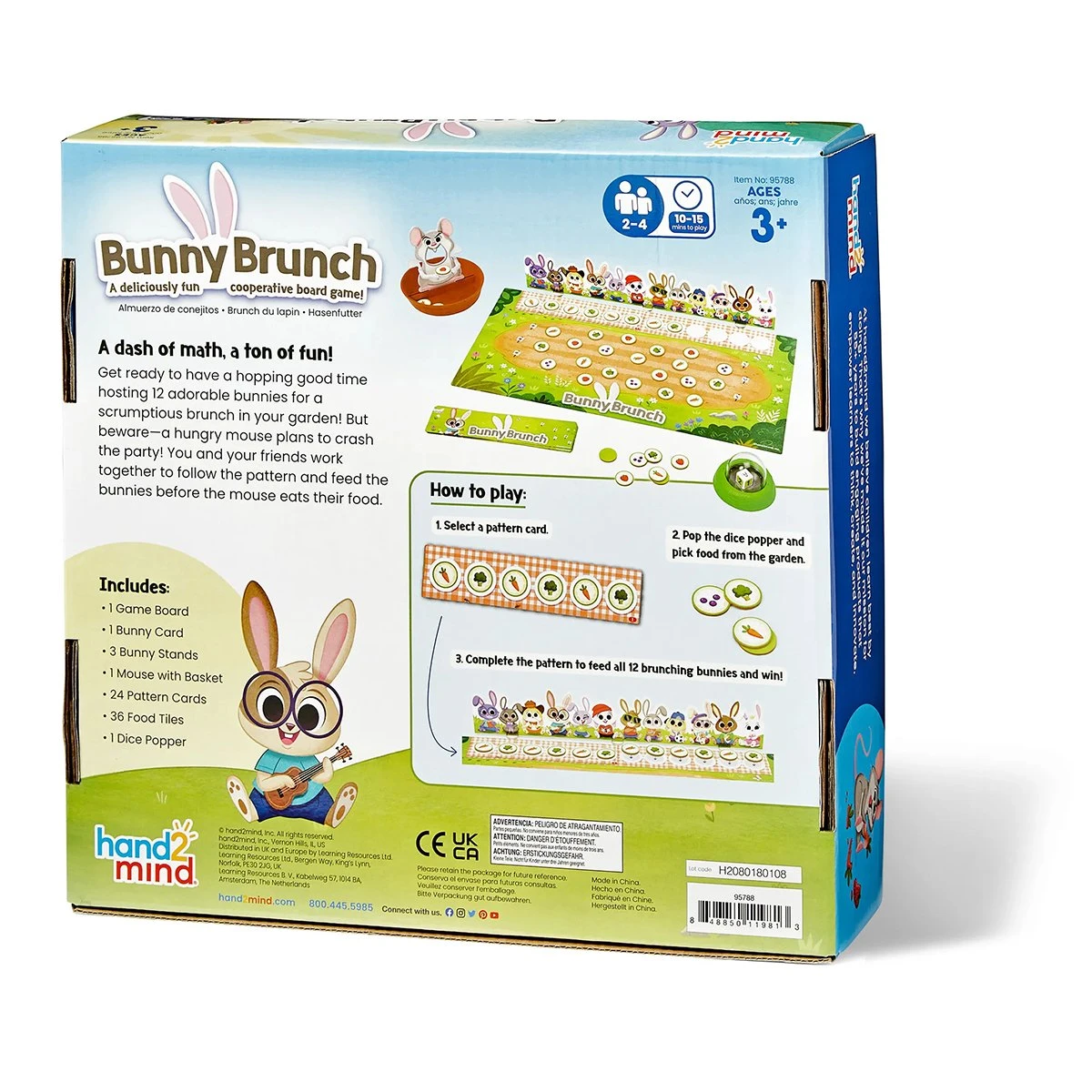 „Брънч със зайци“ е забавна математическа игра, в която малките деца се учат да си сътрудничат и изграждат ранни математически умения. Има 12 гладни зайчета, които са готови да се насладят на моркови, боровинки и други лакомства. Но внимавайте... една палава мишка планира да провали партито! Децата ще трябва да работят заедно, за да попълнят шарките на чиниите и да нахранят гладните зайчета – преди палавото мишле да изяде храната им. Комплектът включва: - 1 игрална дъска; - 1 карта със зайче; - 3 стойки за зайчета; - 1 мишка с кошница; - 24 карти с шаблони; - 36 плочки за храна; - 1 катапулт със зарове; - Ръководство за играта.