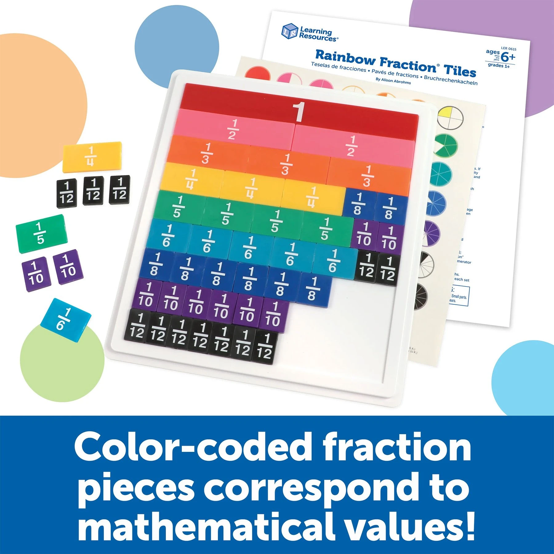 Цветната система е еднаква за всички продукти от серията Rainbow Fraction, което помага на децата лесно да разпознават и свързват еквивалентни дроби в различни форми.