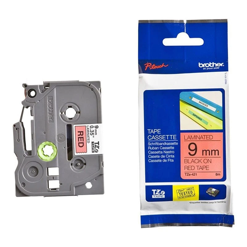 Brother TZE421 е лента с червен фон и черен печат, с ширина 9 mm, подходяща за създаване на ярки етикети.