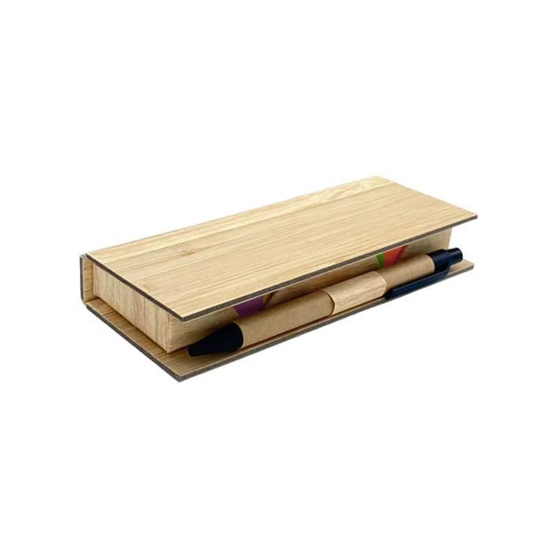 Комплект, включващ листчета за записки, линия и химикалка, в елегантна бамбукова кутия.
