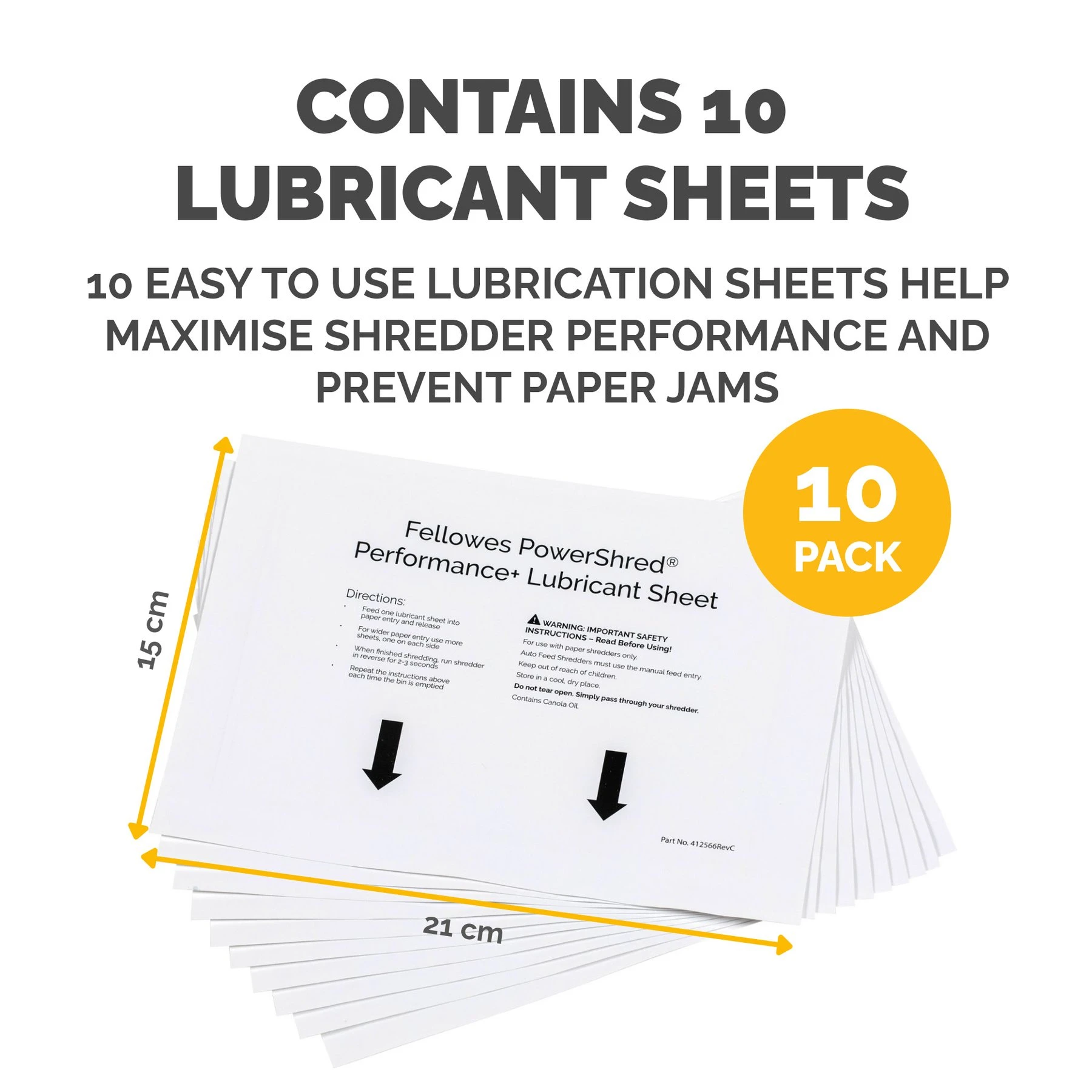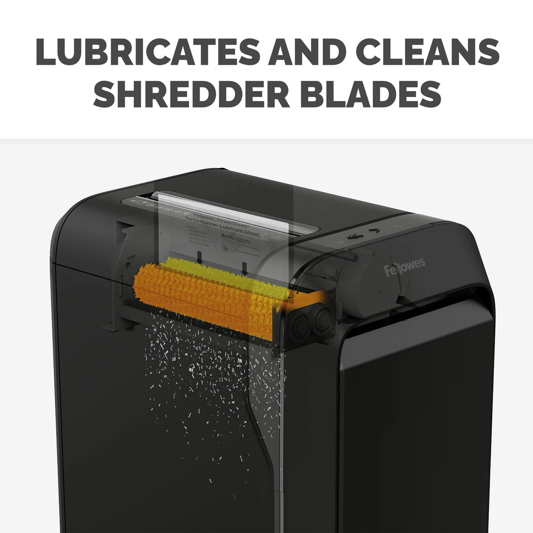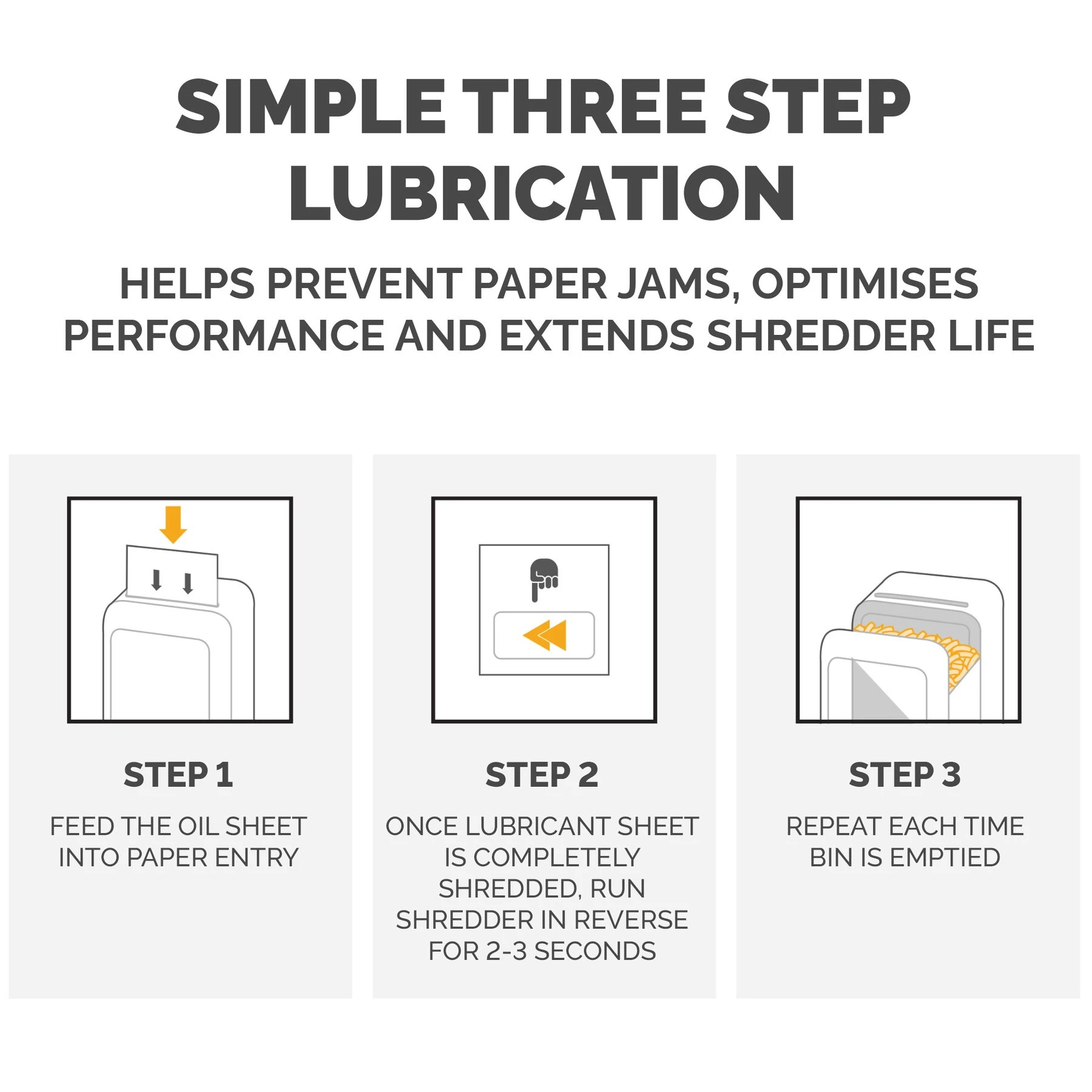 Тези лесни за използване листове оптимизират работата на шредера чрез смазване и почистване на ножовете му, с което допринасят за забавяне на тяхното износване, намалят хартиения прах и предотвратят задръстването на отвора.