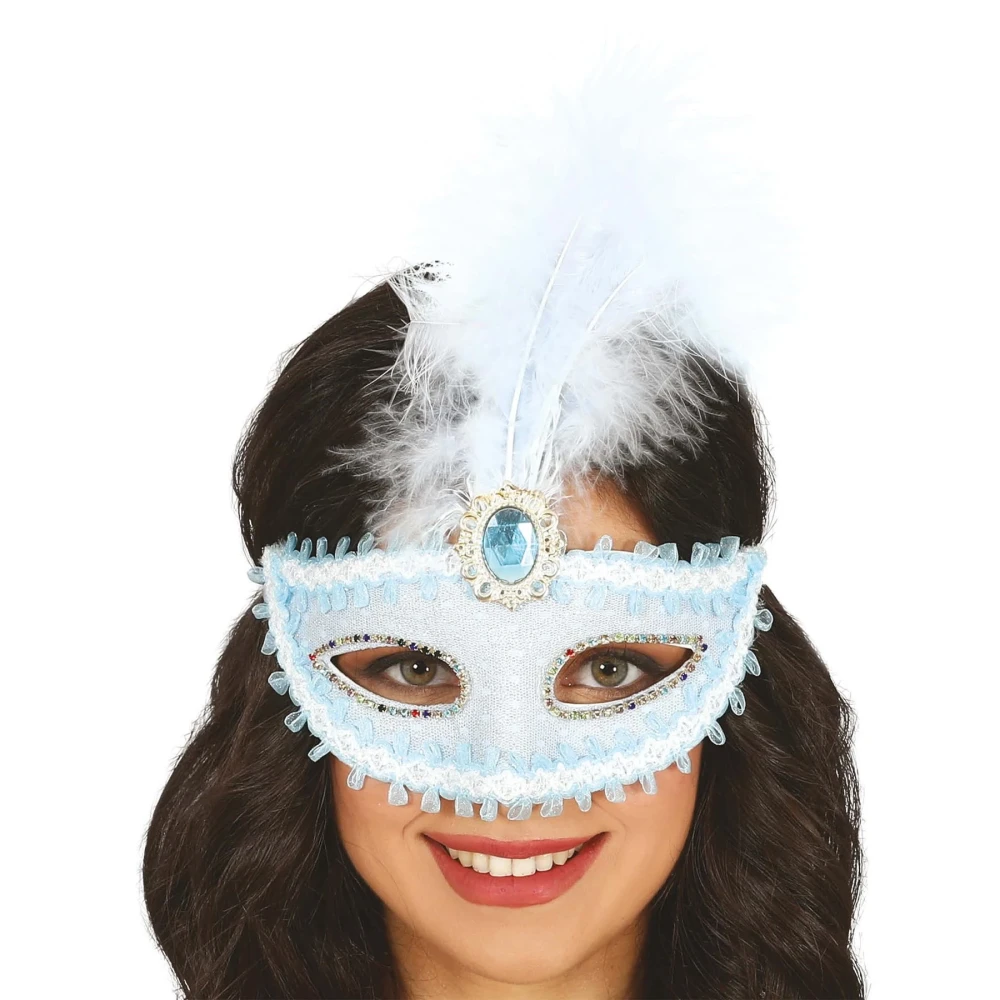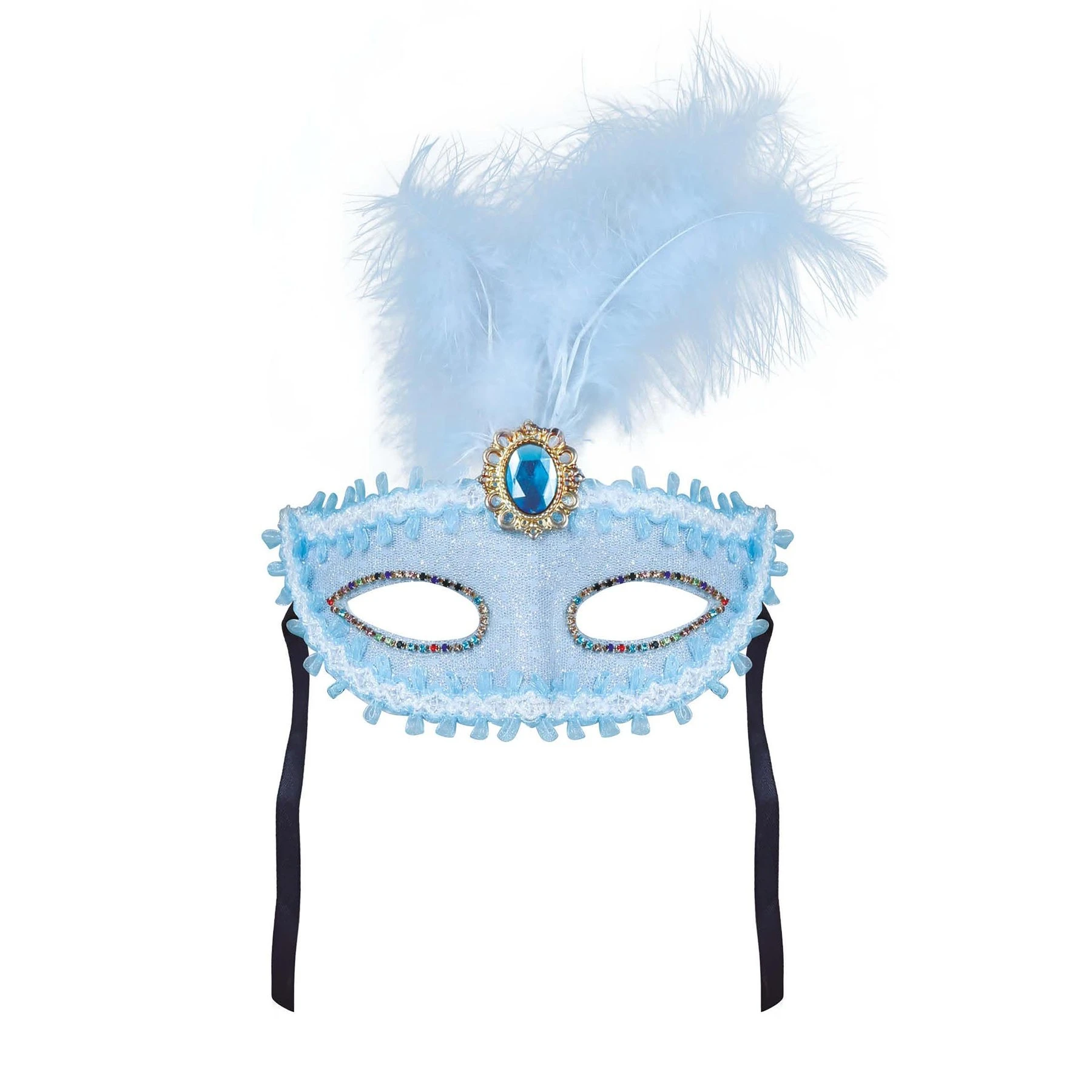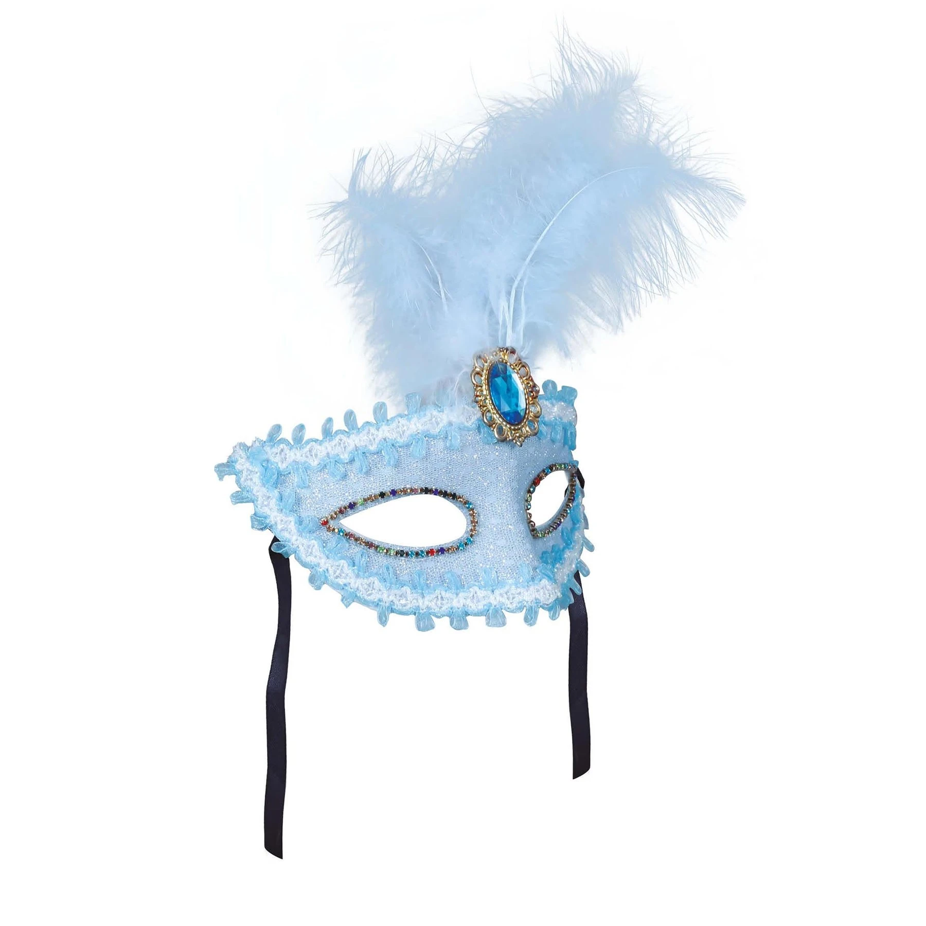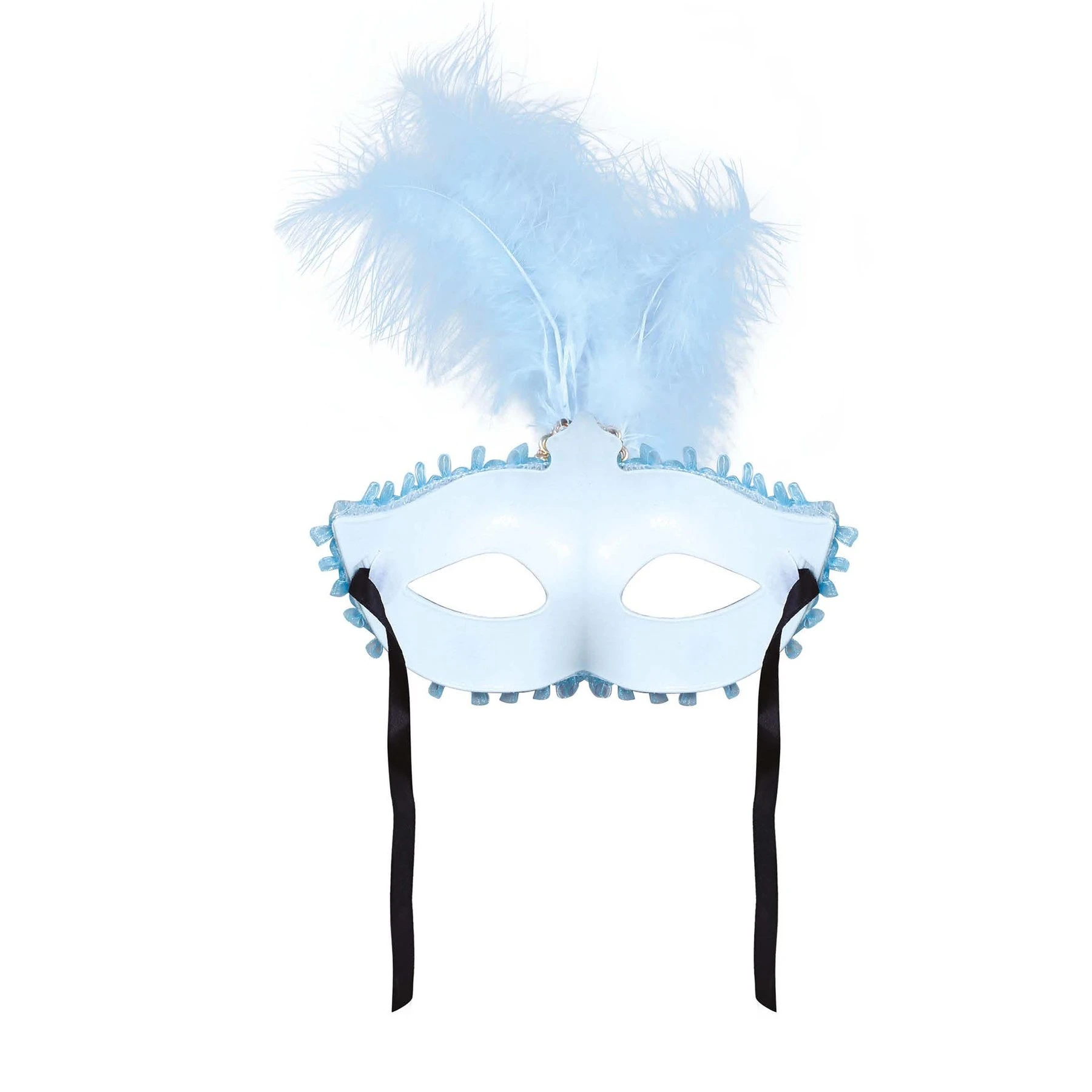 Ефектна маска в наситено син цвят с пищна декорация от пера – перфектният акцент за всяко карнавално или маскарадно събитие.