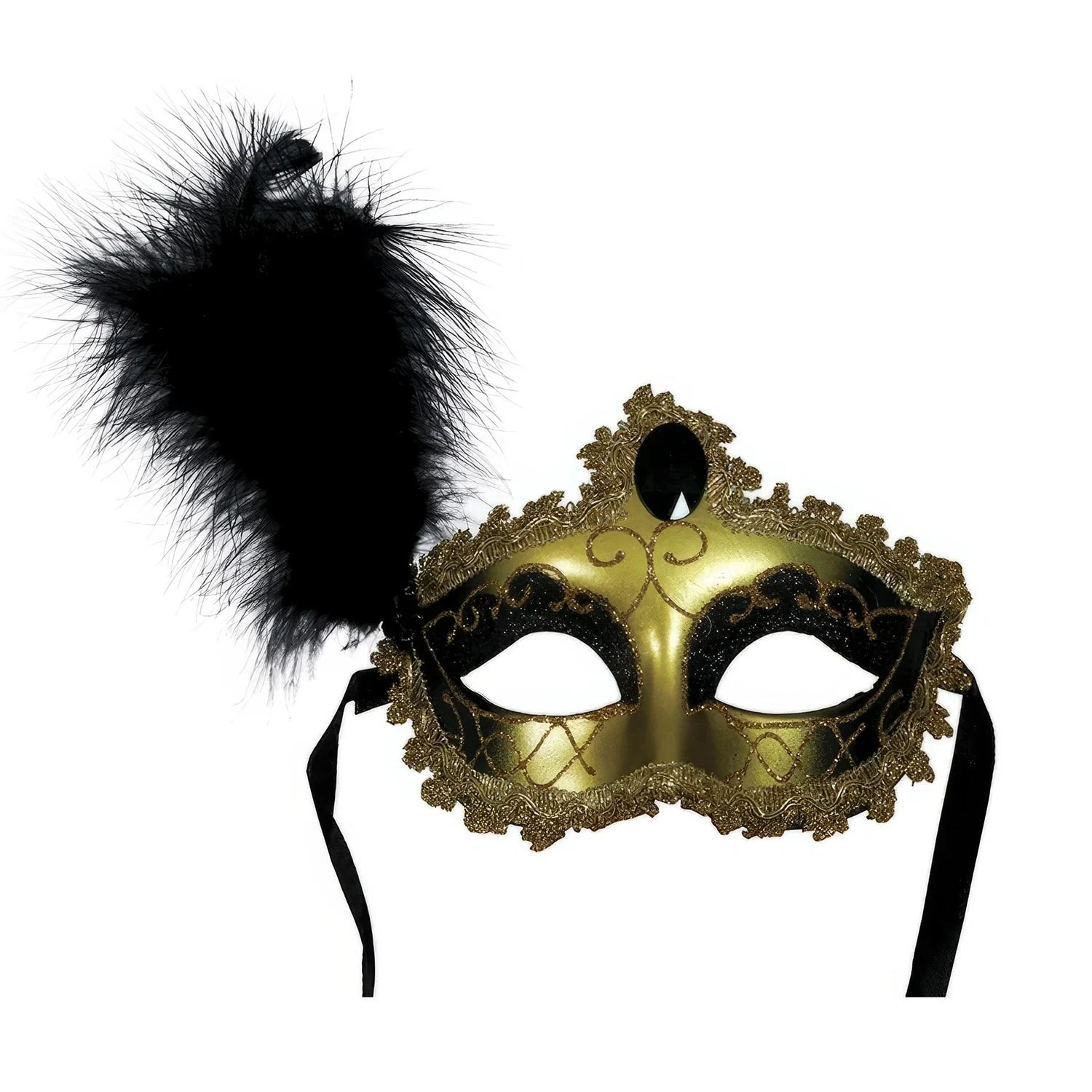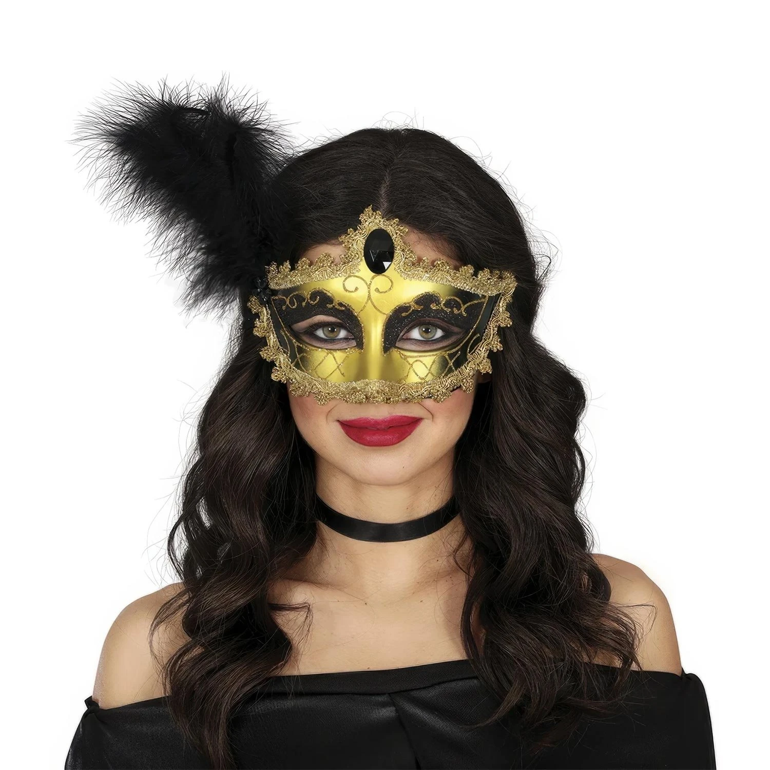 Елегантна маска за лице в златисто и черно, украсена с ефектни пера за още по-драматичен и стилен вид.