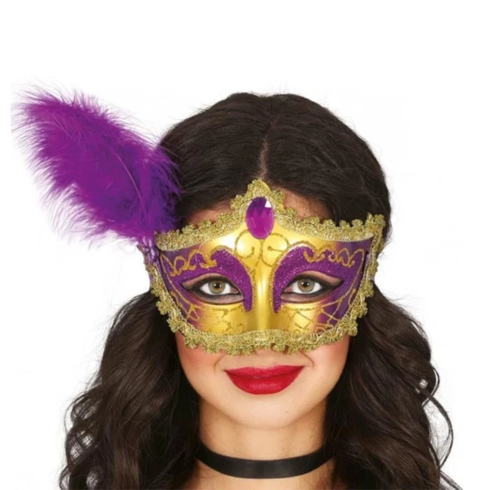 Атрактивна маска в златисто и лилаво, богато украсена с пера за истински кралско излъчване.