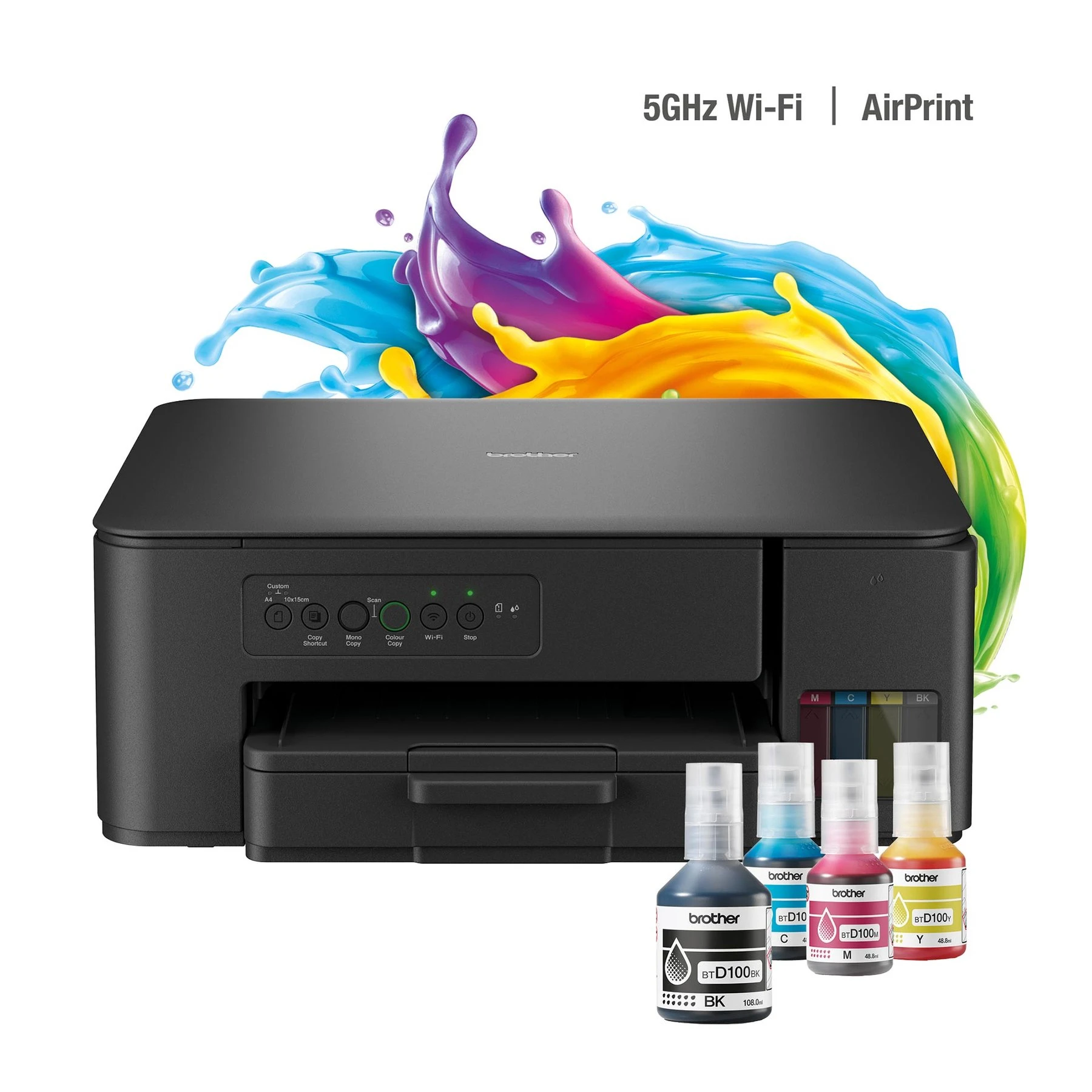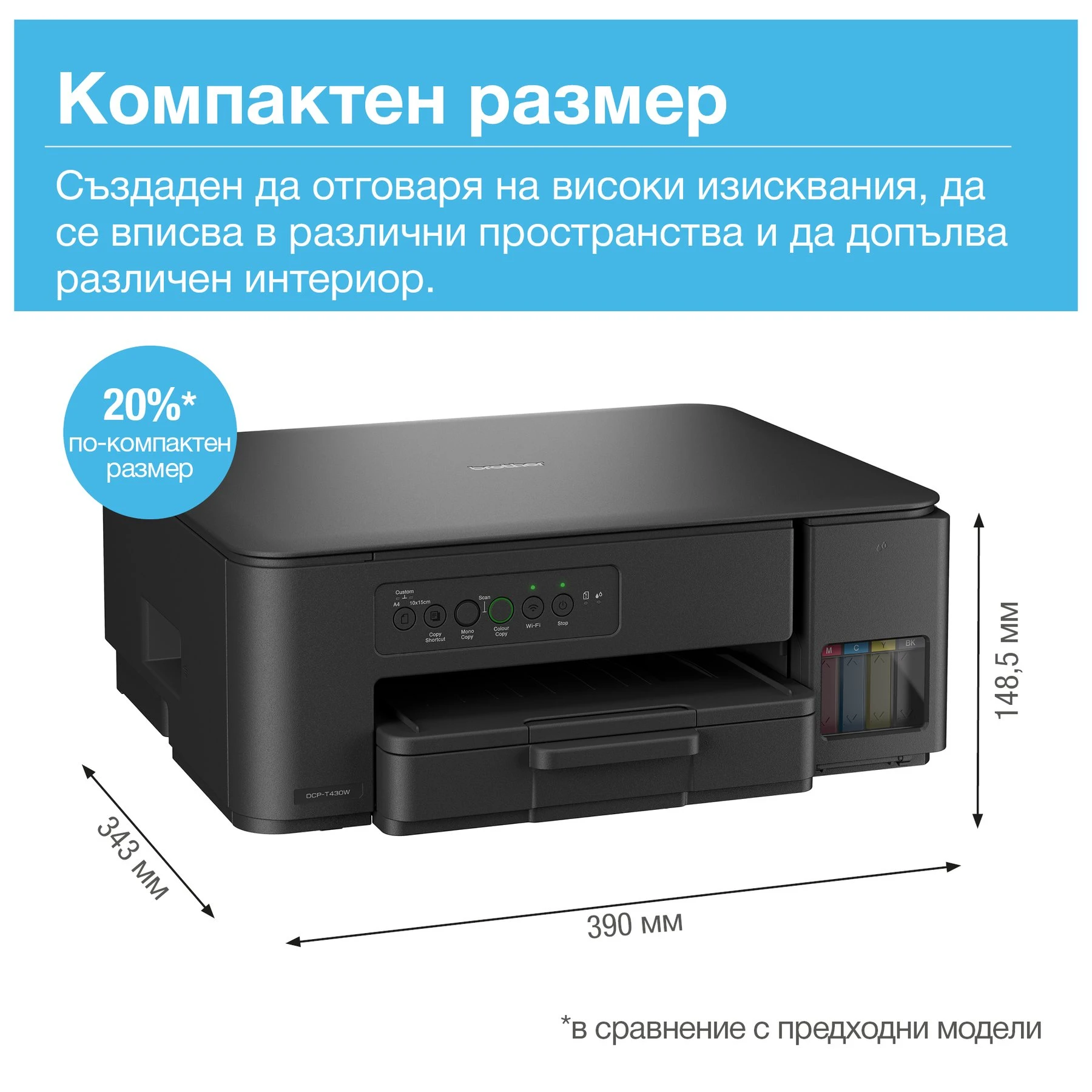 Компактното 3 в 1 мастиленоструйно устройство DCP-T430W печата повече с бутилките със супер голям капацитет, намалявайки стойността на печат за цветна страница. Бързото зареждане на резервоарите с мастило и то без да се налага да държите бутилките прави пълненето лесно и безпроблемно. Иновативната система за заключване на бутилките ви гарантира, че винаги пълните правилния цвят.