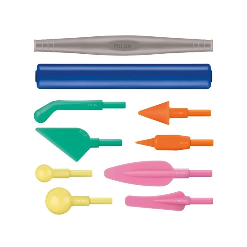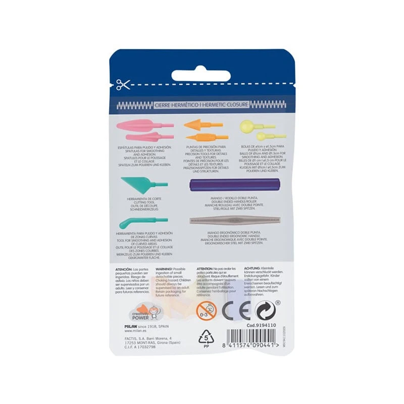 Съдържание: - 1 ергономична дръжка с 2 накрайника в сив цвят; - 1 дръжка с 2 накрайника в син цвят; - 2 шпатули за изглаждане на криви области в зелен цвят; - 1 инструмент за рязане в зелен цвят; - 2 топчета за изглаждане на криви области в жълт цвят с размери 1 cm и 1.5 cm; - 2 инструмента за извайване на прецизни детайли и оформяне на текстури.