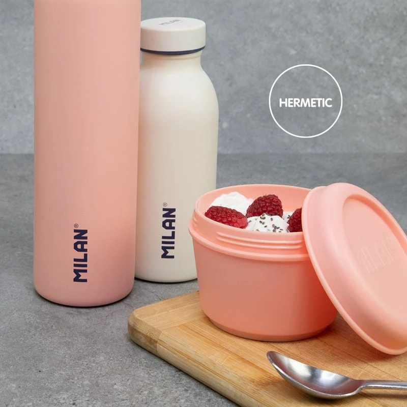 Кръгла кутия за обяд с винтов капак, позволяващ херметично затваряне. Притежава матово външно покритие за по-удобно захващане. Вътрешната част е с гланцово покритие за по-лесно почистване.