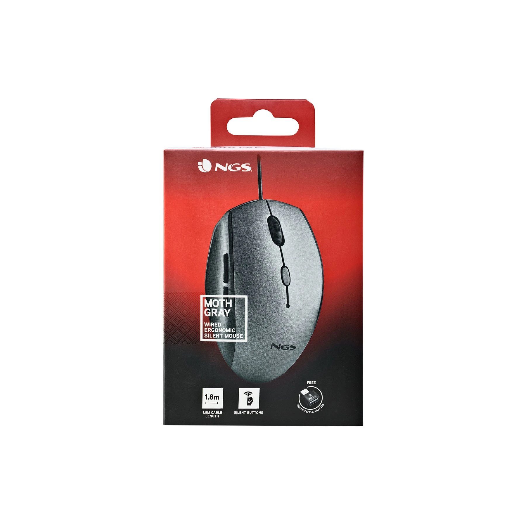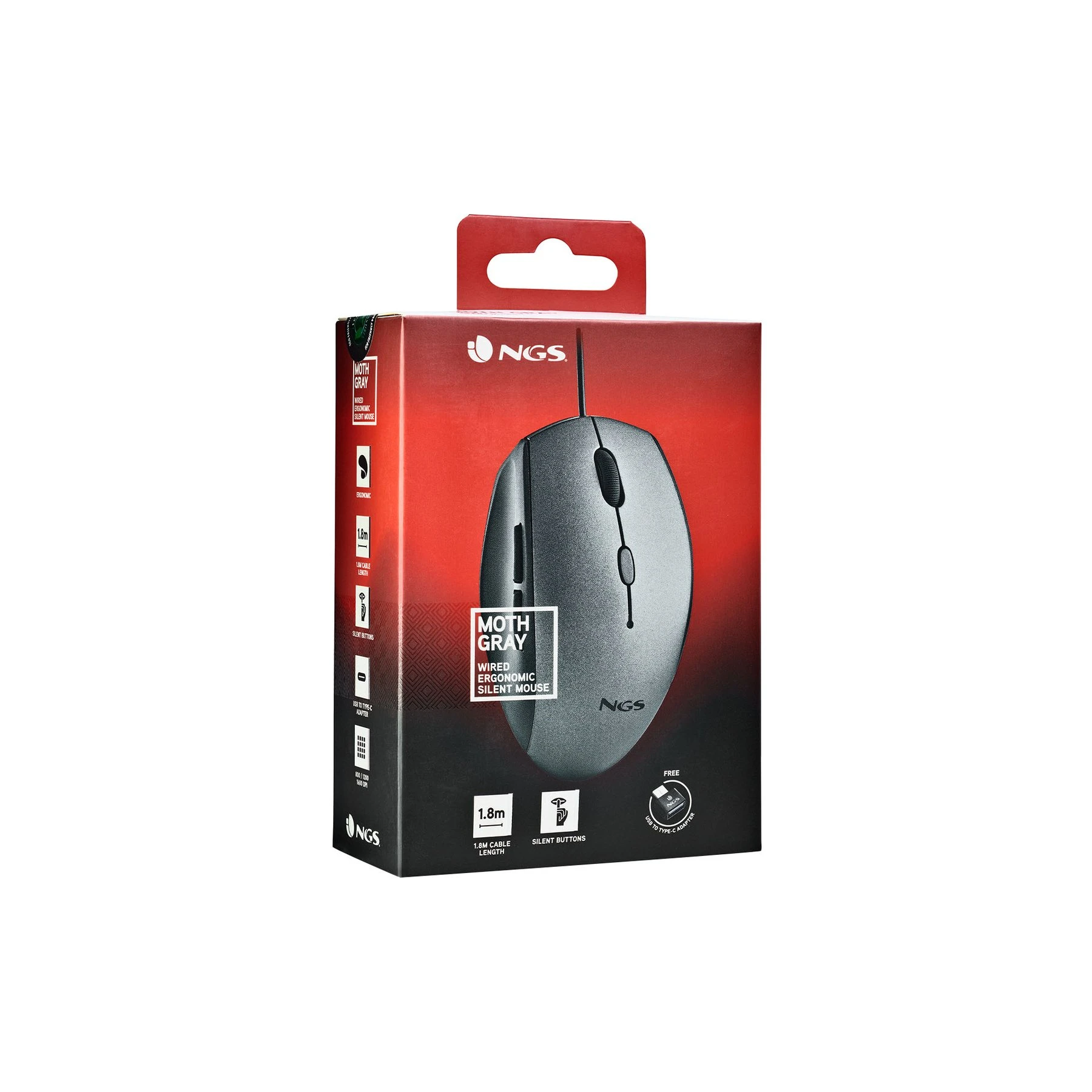 Мишка NGS Moth, с кабел, 6 бутона, USB Type-C, 1600 dpi, сива