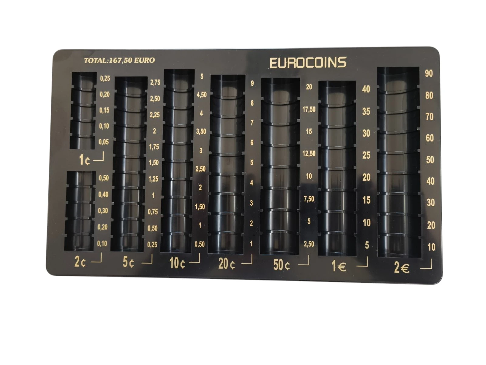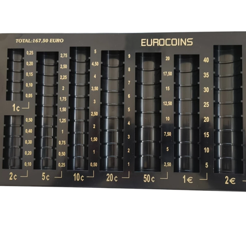 Пластмасов монетник за сортиране на всички видове евро монети, изработен от удароустойчива пластмаса.