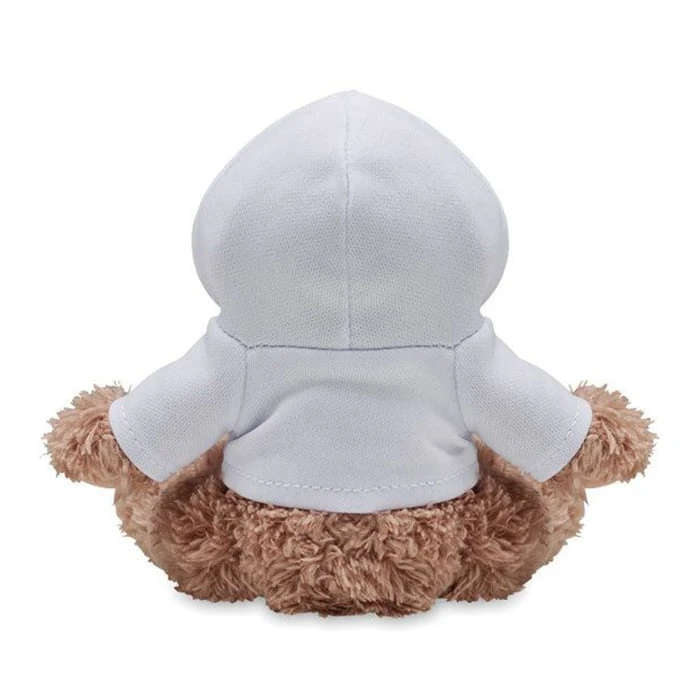 Плюшено куче, облечено в пуловер с качулка.